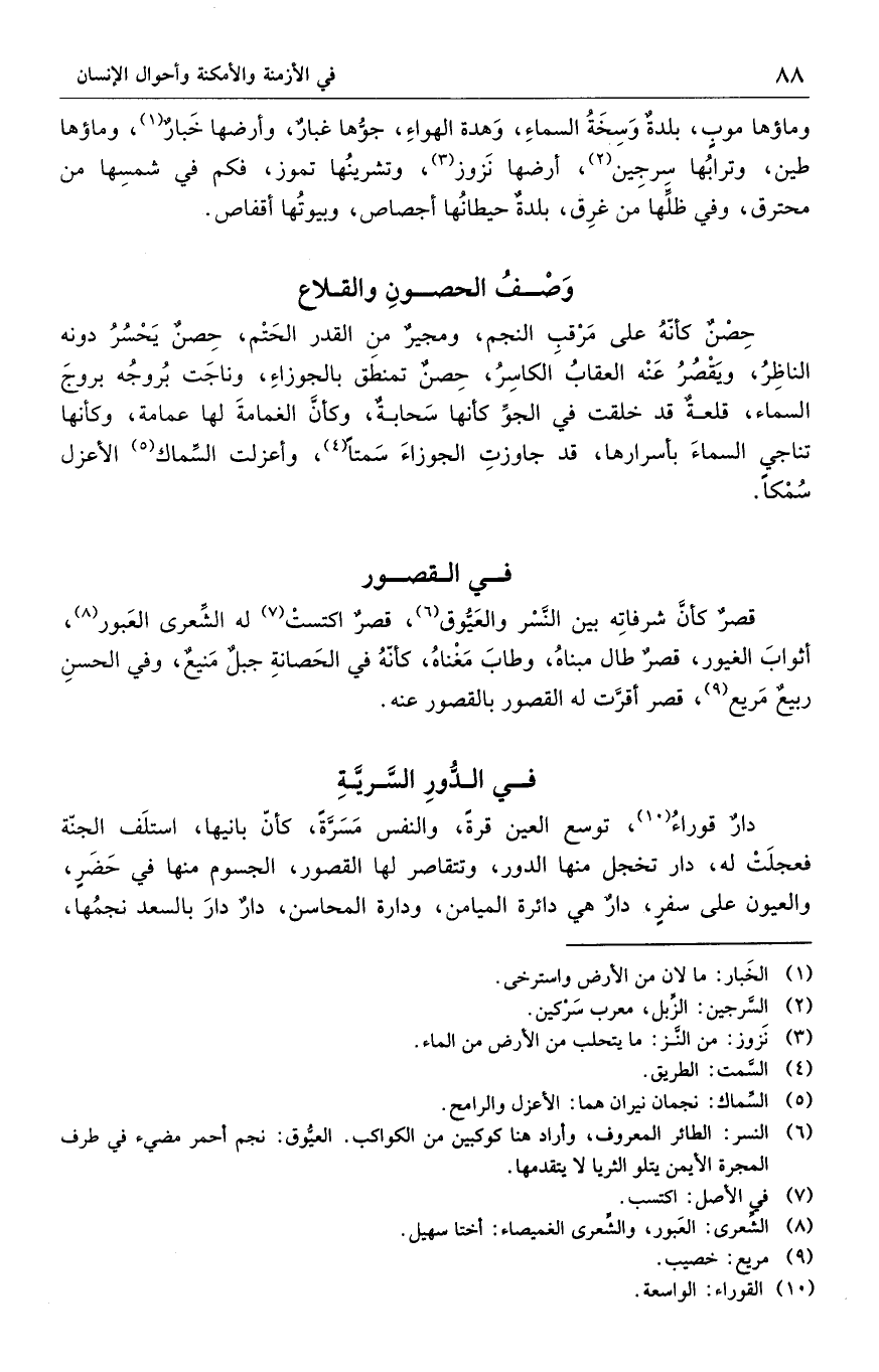 قصرٌ كأنَ شرفاتِه بين النَّسْر والعَيُّوق، قصرٌ اكتستْ له الشِّعرى العَبور، أثوابَ الغيور، قصرٌ طال مبناهُ، وطابَ مَغْناهُ، كأنّهُ في الحَصانةِ جبلٌ مَنيعٌ، وفي الحسنِ ربيعٌ مَريع، قصر أقرَّت له القصور بالقصور عنه.