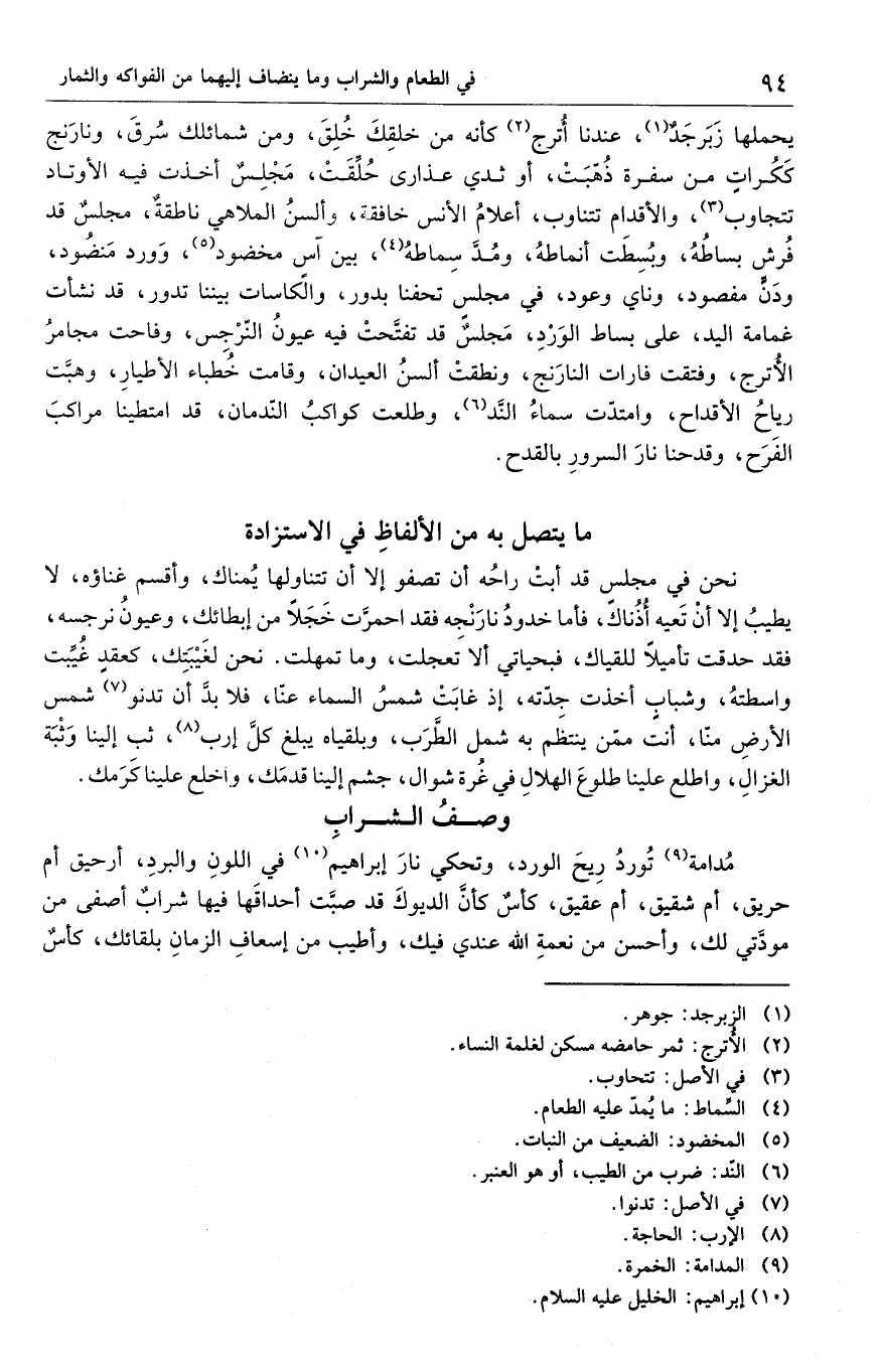 مُدامة تُوردُ رِيحَ الورد، وتحكي نارَ إبراهيم في اللونِ والبردِ، أرحيق أم حريق، أم شقيق، أم عقيق، كأسٌ كأنَ الديوكَ قد صبَّت أحداقَها فيها شرابٌ أصفى من مودَّتي لك، وأحسن من نعمةِ الله عندي فيك، وأطيب من إسعافِ الزمانِ بلقائك، كأسٌ