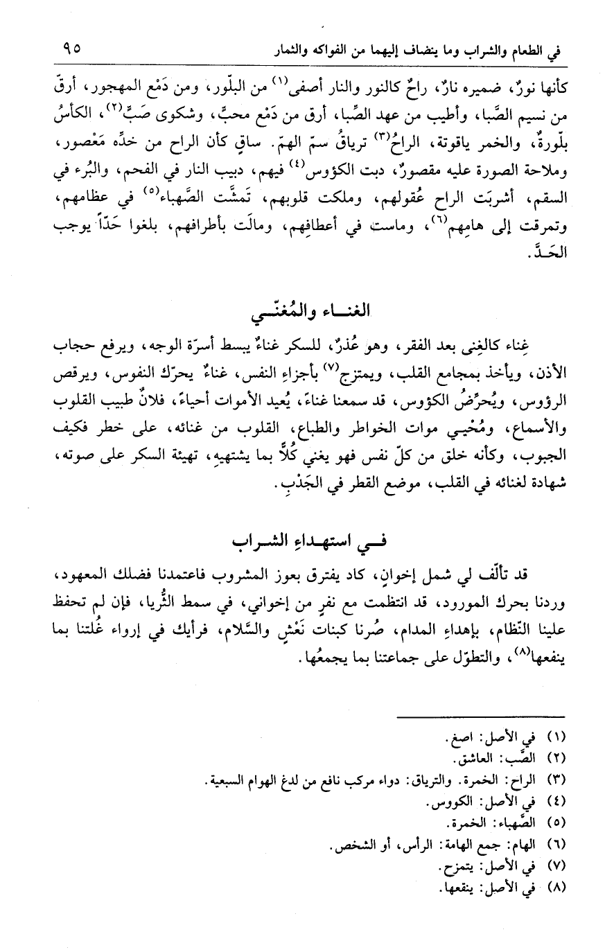 كأنها نورٌ، ضميره نارٌ، راحٌ كالنور والنار أصفىَ من البلور، ومن دَمع المهجور أرقّ من نسيم الصَّبا، وأطيب من عهد الصِّبا، أرق من دَمْع محبٍّ، وشكوى صَبٍّ، الكأسُ بلّورة، والخمر ياقوتة، الراحُ ترياقُ سمّ الهمّ. ساقٍ كأن الراح من خدِّه مَعْصور، وملاحة الصورة عليه مقصورٌ، دبت الكؤوس فيهم، دبيب النار في الفحم، والبُرء في السقم، أشربَت الراح عُقولهم، وملكت قلوبهم، تَمشَت الصَّهباء في عظامهم، وتمرقت إلى هامِهم، وماست في أعطافِهم، ومالَت بأطرافهم، بلغوا حَدّاً يوجب الحَدَّ.