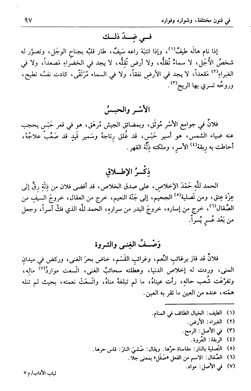 فلان في جوامع الأسْر مُوثَق، وبمضائق الجيش مُرهَق، هو في قعر حَبْسٍ يحجب عنه ضياء الشمس، هو أسير حَبْس، قد غُلق رِتاجهُ وسَمير قَيدٍ قد صَعُب علاجُهُ، أحاطت به رِبقة الأسرِ، وملكته ذِلة القهر.