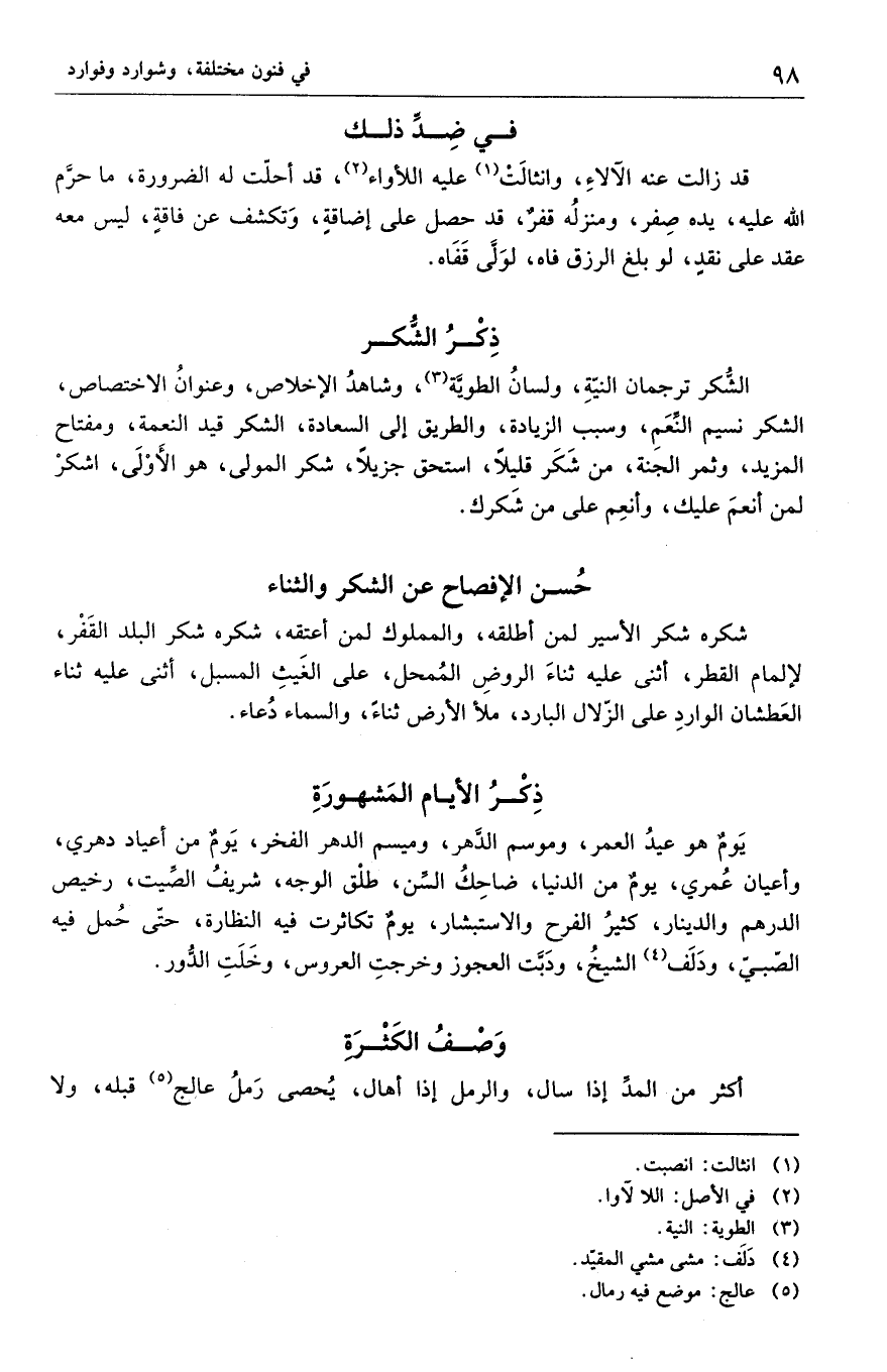 يَومٌ هو عيدُ العمر، وموسم الدَّهر، وميسم الدهر الفخر، يَومٌ من أعياد دهري، وأعيان عُمري، يومٌ من الدنيا، ضاحِكُ السِّن، طلْق الوجه، شريفُ الصَيت، رخيص الدرهم والدينار، كثيرُ الفرح والاستبشار، يومٌ تكاثرت فيه النظارة، حتّى حُمل فيه الصّبيّ، ودَلَف الشيخُ، ودَبَت العجوز وخرجتِ العروس، وخَلَتِ الدُّور.