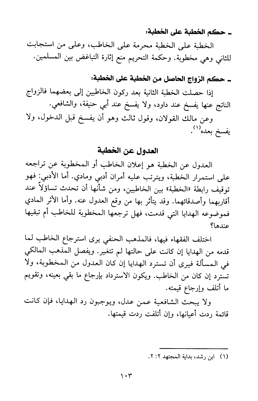 العدول عن الخطبة هو إعلان الخاطب أو المخطوبة عن تراجعه على استمرار الخطبة، ويترتب عليه أمران أدبي ومادي. أما الأدبي: فهو توقيف رابطة الخطبة بين الخاطبين، ومن شأنها أن تحدث تساؤلًا عند أقاربهما وأصدقائهما. وقد يتأثر بها من وقع العدول عنه. وأما الأثر المادي فموضوعه الهدايا التي قدمت، فهل ترجعها المخطوبة للخاطب أم تبقيها عندها؟