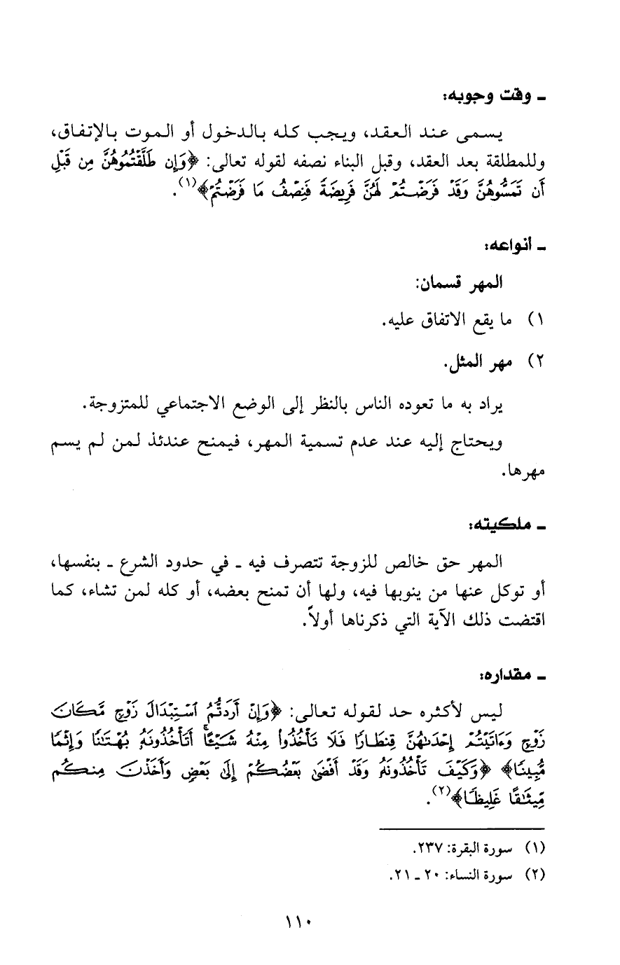 يسمى عند العقد، ويجب كله بالدخول أو الموت بالإتقاق، وللمطلقة بعد العقد، وقبل البناء نصفه لقوله تعالى: {وَإِنْ طَلَّقْتُمُوهُنَّ مِنْ قَبْلِ أَنْ تَمَسُّوهُنَّ وَقَدْ فَرَضْتُمْ لَهُنَّ فَرِيضَةً فَنِصْفُ مَا فَرَضْتُمْ} 1.