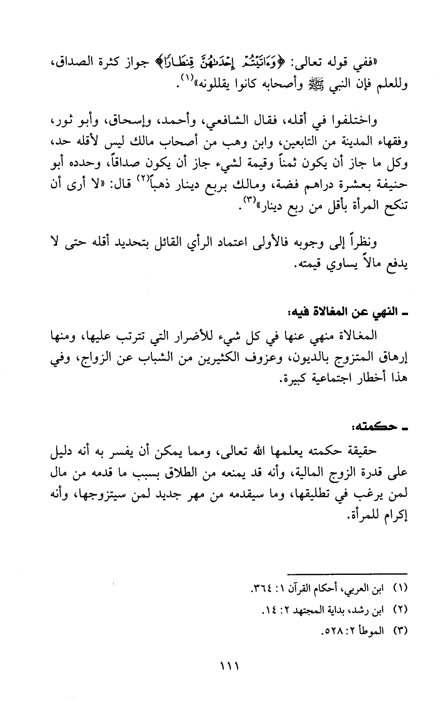ففي قوله تعالى: {وَآتَيْتُمْ إِحْدَاهُنَّ قِنطَاراً} جواز كثرة الصداق، وللعلم فإن النبي -صلى الله عليه وسلم- وأصحابه كانوا يقللونه1.