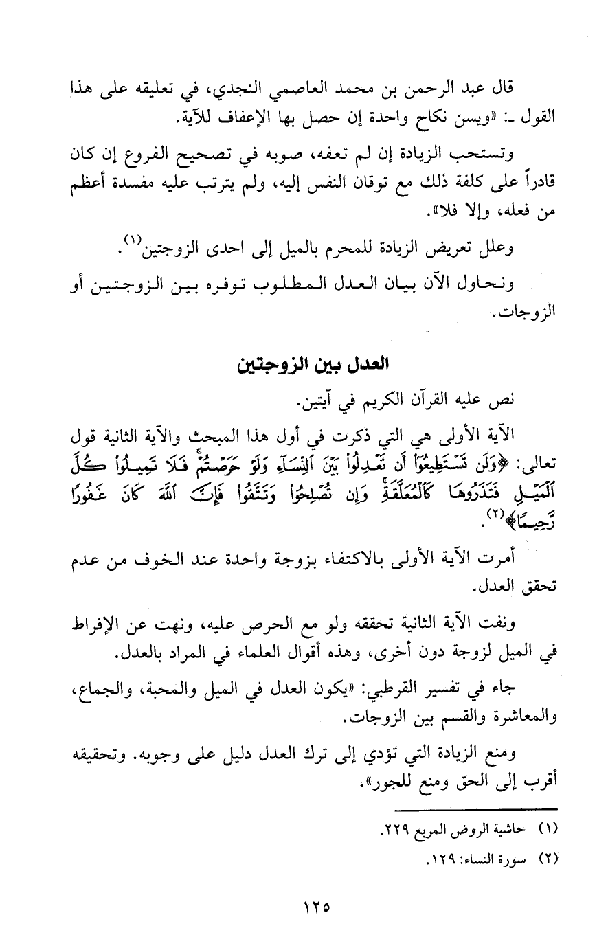 ونفت الآية الثانية تحققه ولو مع الحرص عليه، ونهت عن الإفراط في الميل لزوجة دون أخرى، وهذه أقوال العلماء في المراد بالعدل.