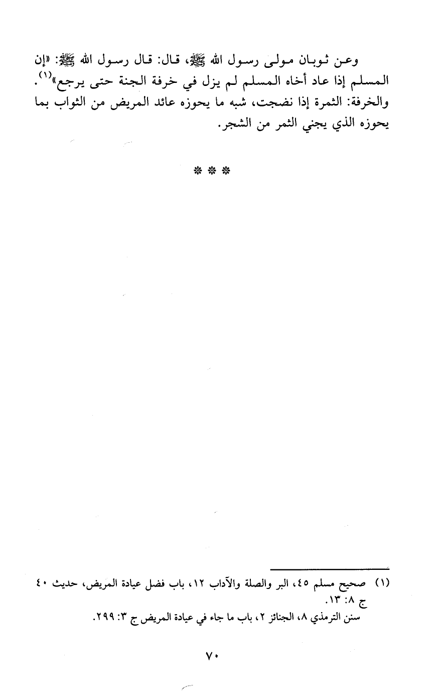 وعن ثوبان مولى رسول الله -صلى الله عليه وسلم- قال: قال رسول الله -صلى الله عليه وسلم-: "إن المسلم إذا عاد أخاه المسلم لم يزل في خرفة الجنة حتى يرجع" 1.