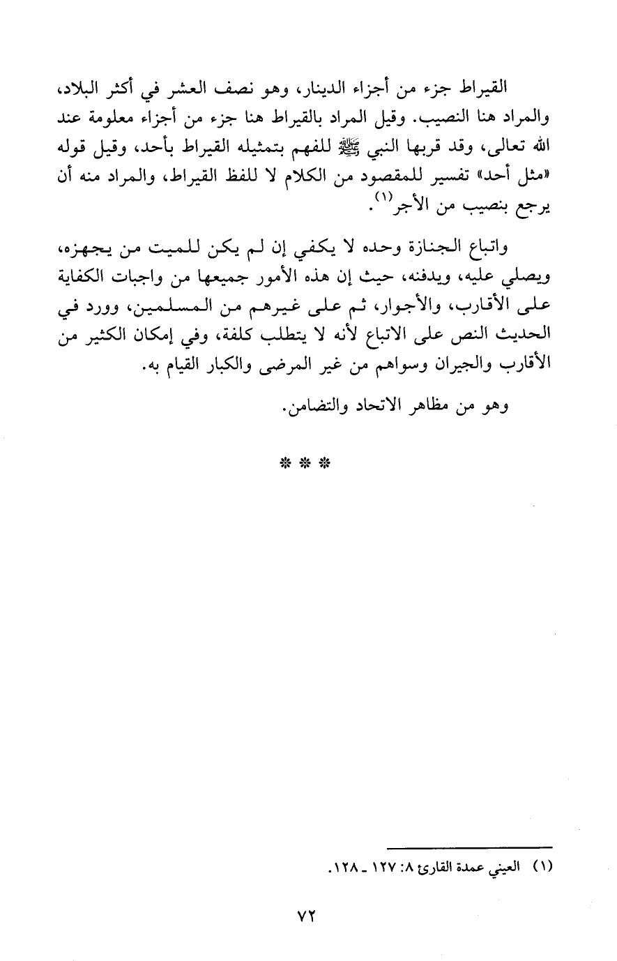 القيراط جزء من أجزاء الدينار، وهو نصف العشر في أكثر البلاد، والمراد هنا النصيب. وقيل المراد بالقيراط هنا جزء من أجزاء معلومة عند الله تعالى، وقد قربها النبي -صلى الله عليه وسلم- للفهم بتمثيله القيراط بأحد، وقيل قوله: "مثل أحد" تفسير المقصود من الكلام لا للفظ القيراط، والمراد منه أن يرجع بنصيب من الأجر1.