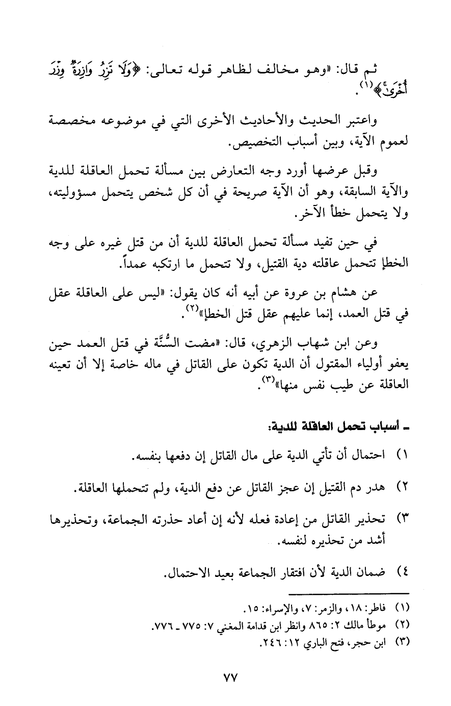 وقبل عرضها أورد وجه التعارض بين مسألة تحمل العاقلة للدية والآية السابقة، وهو أن الآية صريحة في أن كل شخص يتحمل مسؤوليته، ولا يتحمل خطأ الآخر.