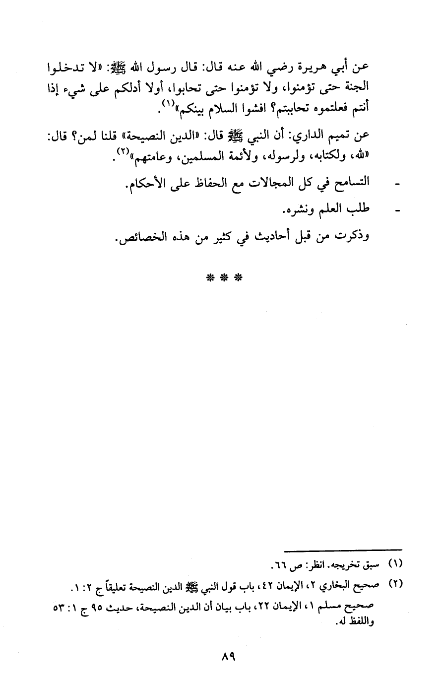 عن تميم الداري: أن النبي -صلى الله عليه وسلم- قال: "الدين النصيحة" قلنا لمن؟ قال: "لله، ولكتابه، ولرسوله، ولأئمة المسلمين، وعامتهم" 2.