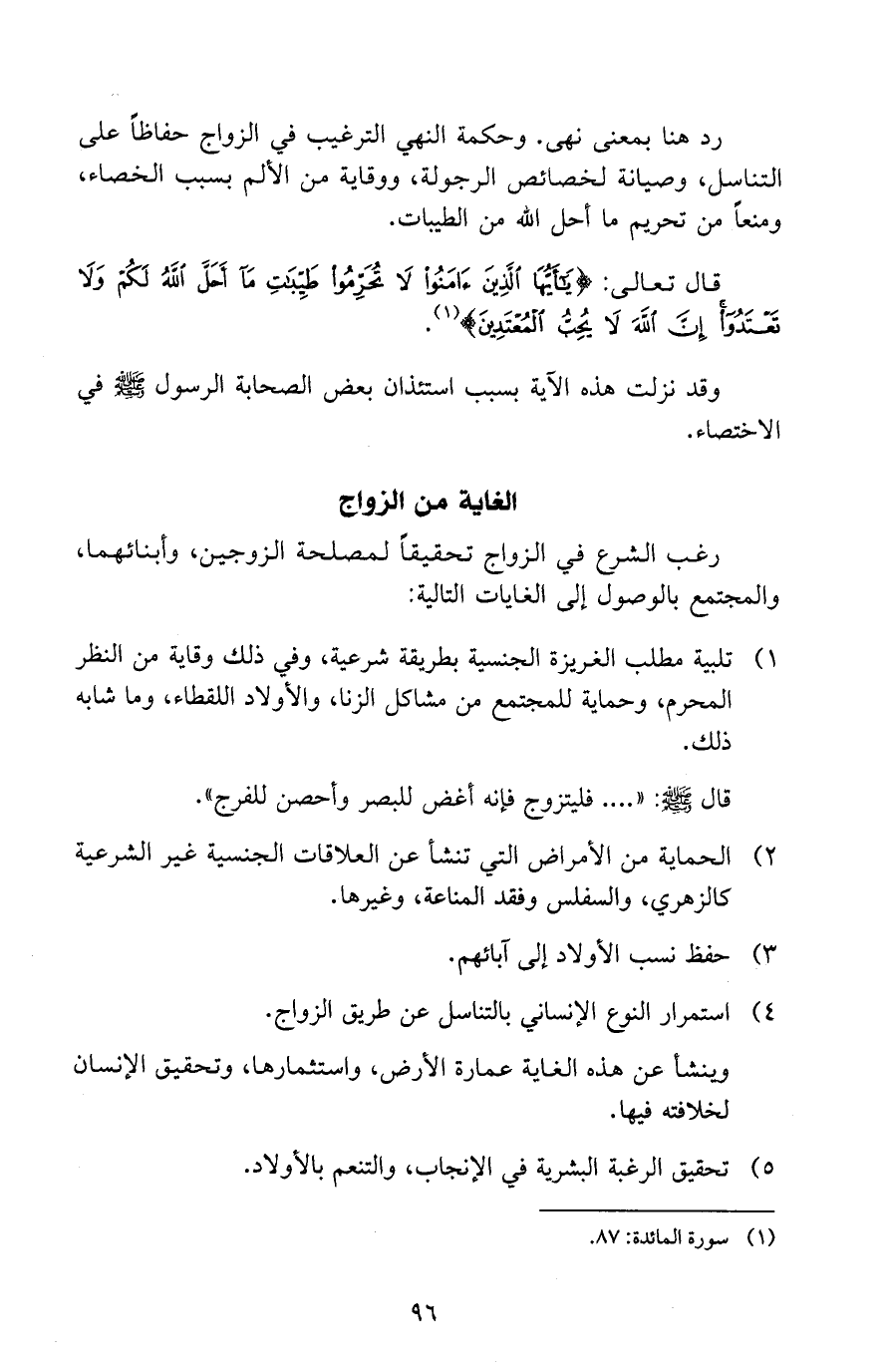1 تلبية مطلب الغريزة الجنسية بطريقة شرعية، وفي ذلك وقاية من النظر المحرم، وحماية للمجتمع من مشاكل الزنا، والأولاد اللقطاء، وما شابه ذلك.