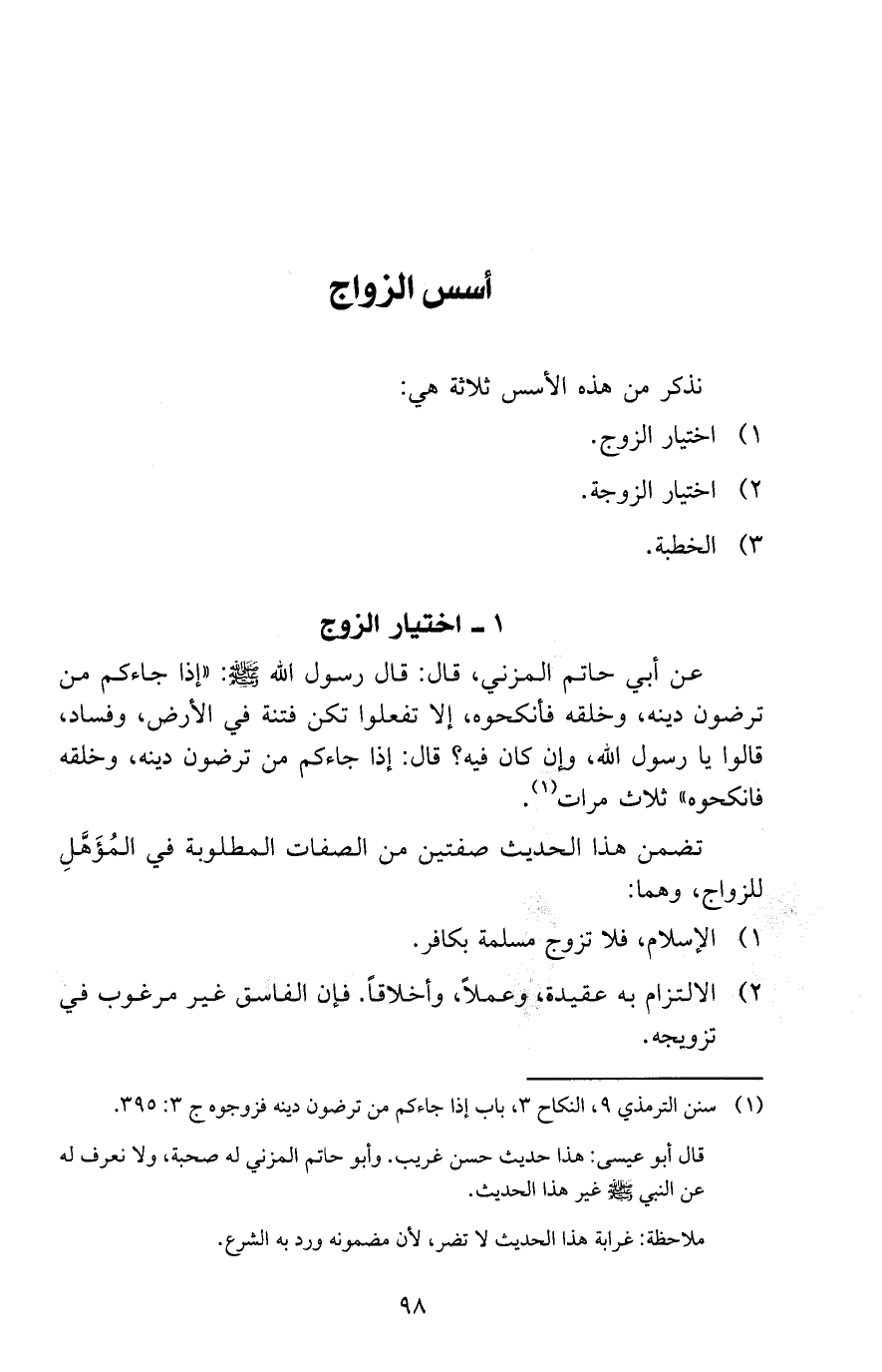 1 سنن الترمذي 9، النكاح 3، باب إذا جاءكم من ترضون دينه فزوجوه ج3: 395.
