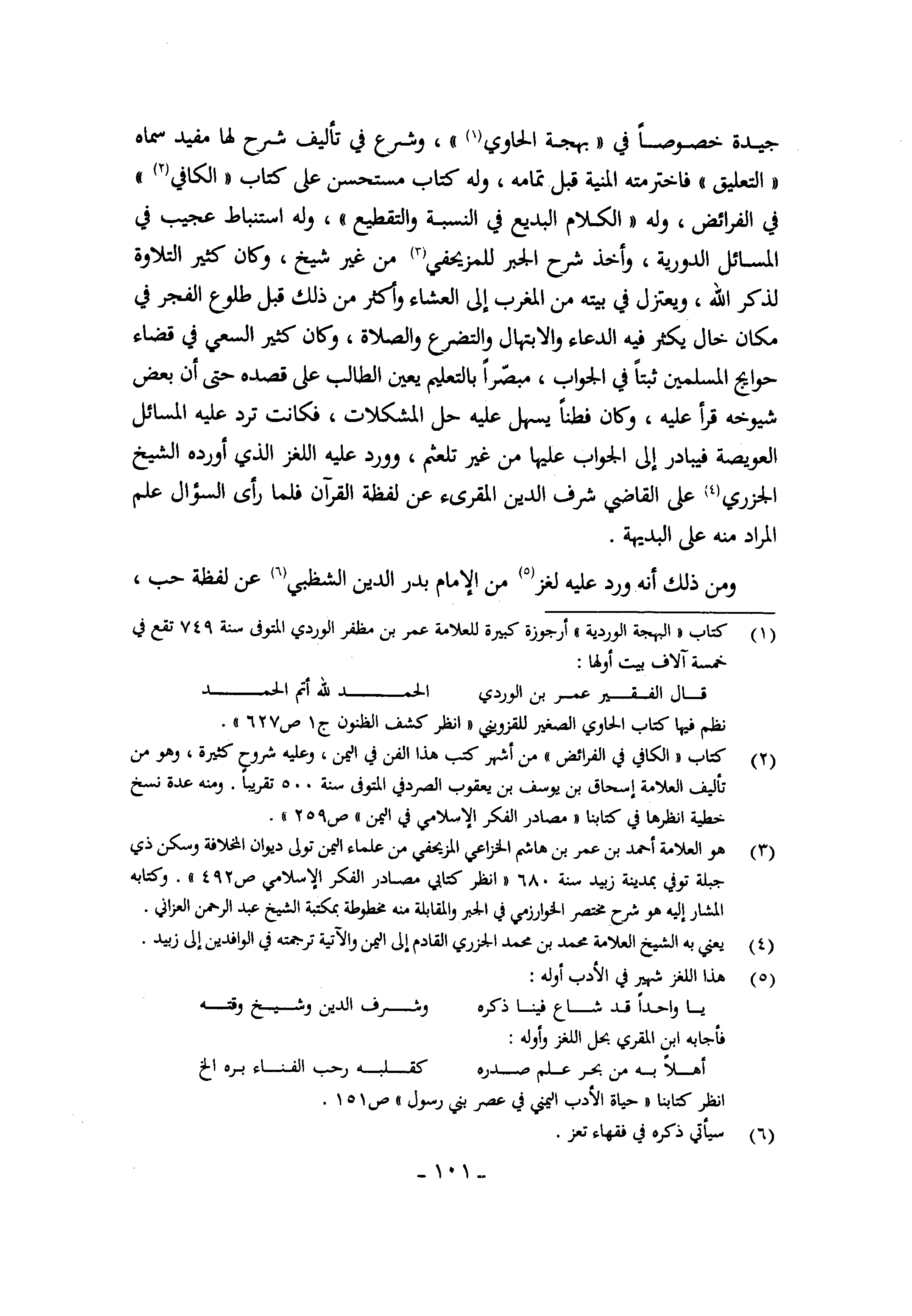 جَيِّدَة خُصُوصا فِي بهجة الْحَاوِي وَشرع فِي تأليف شرح لَهَا مُفِيد سَمَّاهُ التَّعْلِيق فاخترمته الْمنية قبل تَمَامه وَله كتاب مستحسن على كتاب الْكَافِي فِي الْفَرَائِض وَله الْكَلَام البديع فِي النِّسْبَة والتقطيع وَله استنباط عَجِيب فِي الْمسَائِل الدورية وَأخذ شرح الْجَبْر للمزيحفي من غير شيخ وَكَانَ كثير التِّلَاوَة لذكر الله ويعتزل فِي بَيته من الْمغرب إِلَى الْعشَاء وَأكْثر من ذَلِك قبل طُلُوع الْفجْر فِي مَكَان خَال يكثر فِيهِ الدُّعَاء والابتهال والتضرع وَالصَّلَاة وَكَانَ كثير السَّعْي فِي قَضَاء حوايج الْمُسلمين ثبتا فِي الْجَواب مبصرا بالتعليم يعين الطَّالِب على قَصده حَتَّى أَن بعض شُيُوخه قَرَأَ عَلَيْهِ وَكَانَ فطنا يسهل عَلَيْهِ حل المشكلات فَكَانَت ترد عَلَيْهِ الْمسَائِل العويصة فيبادر إِلَى الْجَواب عَلَيْهَا من غير تلعثم وَورد عَلَيْهِ اللغز الَّذِي أوردهُ الشَّيْخ الْجَزرِي على القَاضِي شرف الدّين المقرىء عَن لَفْظَة الْقُرْآن فَلَمَّا رأى السُّؤَال علم المُرَاد مِنْهُ على البديهة