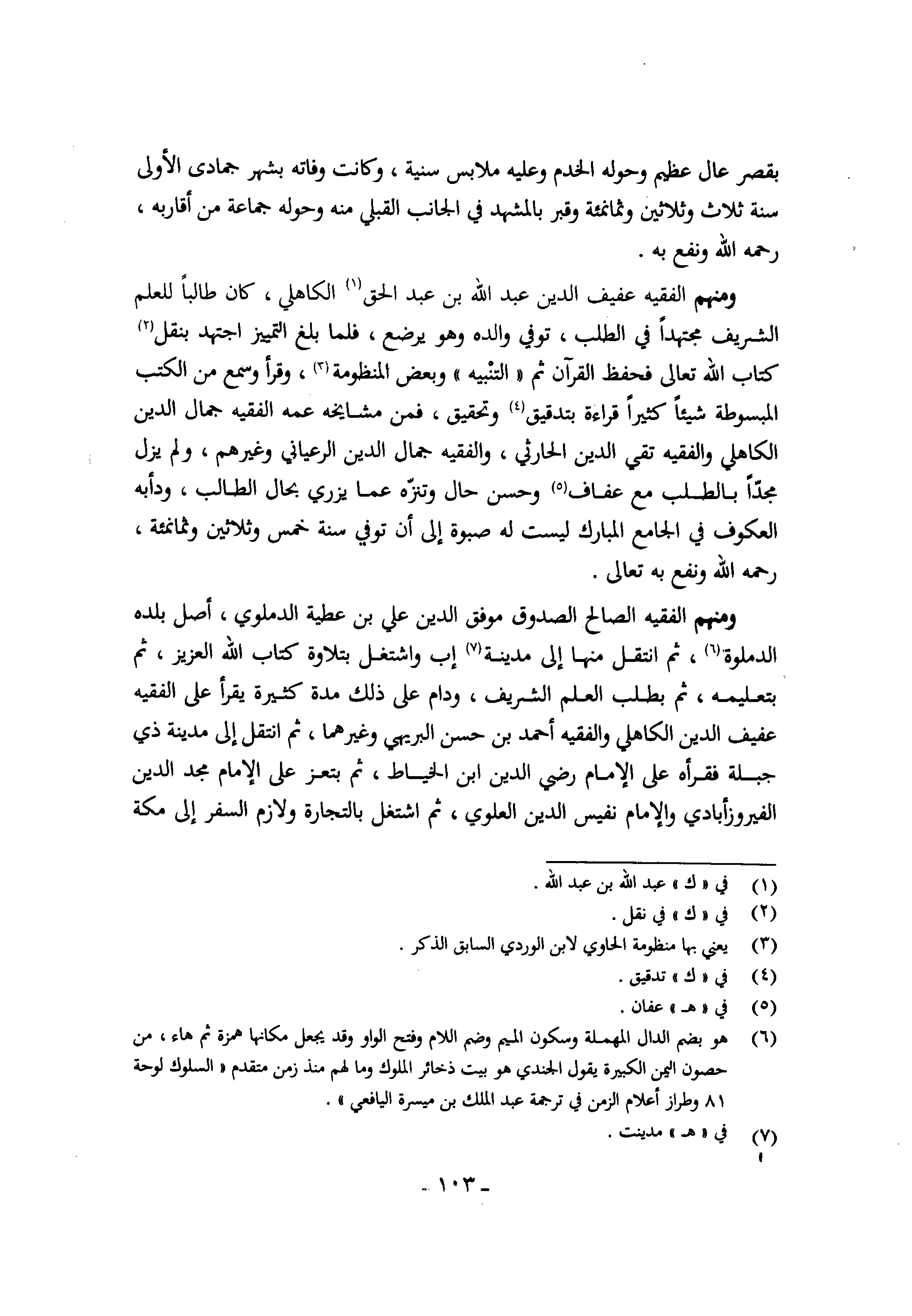 وَمِنْهُم الْفَقِيه عفيف الدّين عبد الله بن عبد الْحق الْكَاهِلِي كَانَ طَالبا للْعلم الشريف مُجْتَهدا فِي الطّلب توفّي وَالِده وَهُوَ يرضع فَلَمَّا بلغ التَّمْيِيز اجْتهد بِنَقْل كتاب الله تَعَالَى فحفظ الْقُرْآن ثمَّ التَّنْبِيه وَبَعض الْمَنْظُومَة وَقَرَأَ وَسمع من الْكتب المبسوطة شَيْئا كثيرا قِرَاءَة بتدقيق وَتَحْقِيق فَمن مشايخه عَمه الْفَقِيه جمال الدّين الْكَاهِلِي والفقيه تَقِيّ الدّين الْحَارِثِيّ والفقيه جمال الدّين الرعياني وَغَيرهم وَلم يزل مجدا بِالطَّلَبِ مَعَ عفاف وَحسن حَال وتنزه عَمَّا يزري بِحَال الطَّالِب ودأبه العكوف فِي الْجَامِع الْمُبَارك لَيست لَهُ صبوة إِلَى أَن توفّي سنة خمس وَثَلَاثِينَ وثمانمئة رَحمَه الله ونفع بِهِ تَعَالَى