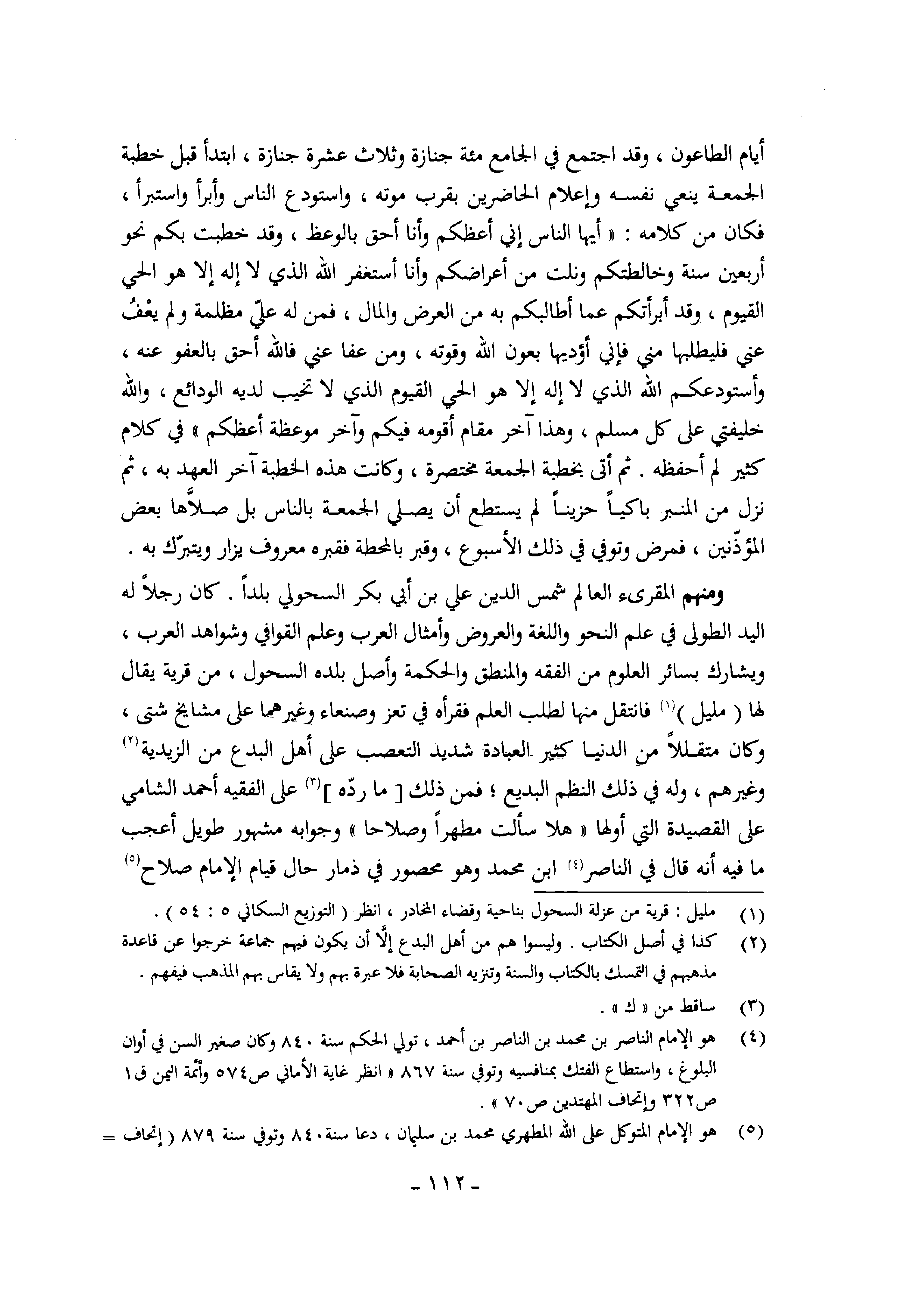 وَمِنْهُم المقرىء الْعَالم شمس الدّين عَليّ بن أبي بكر السحولي بَلَدا كَانَ رجلا لَهُ الْيَد الطُّولى فِي علم النَّحْو واللغة وَالْعرُوض وأمثال الْعَرَب وَعلم القوافي وشواهد الْعَرَب ويشارك بِسَائِر الْعُلُوم من الْفِقْه والمنطق وَالْحكمَة وأصل بَلَده السحول من قَرْيَة يُقَال لَهَا مليل فانتقل مِنْهَا لطلب الْعلم فقرأه فِي تعز وَصَنْعَاء وَغَيرهمَا على مَشَايِخ شَتَّى وَكَانَ متقللا من الدُّنْيَا كثير الْعِبَادَة شَدِيد التعصب على أهل الْبدع من الزيدية وَغَيرهم وَله فِي ذَلِك النّظم البديع فَمن ذَلِك مَا رده على الْفَقِيه أَحْمد الشَّامي على القصيدة الَّتِي أَولهَا هلا سَأَلت مطهرا وصلاحا وَجَوَابه مَشْهُور طَوِيل أعجب مَا فِيهِ أَنه قَالَ فِي النَّاصِر ابْن مُحَمَّد وَهُوَ مَحْصُور فِي ذمار حَال قيام الإِمَام صَلَاح