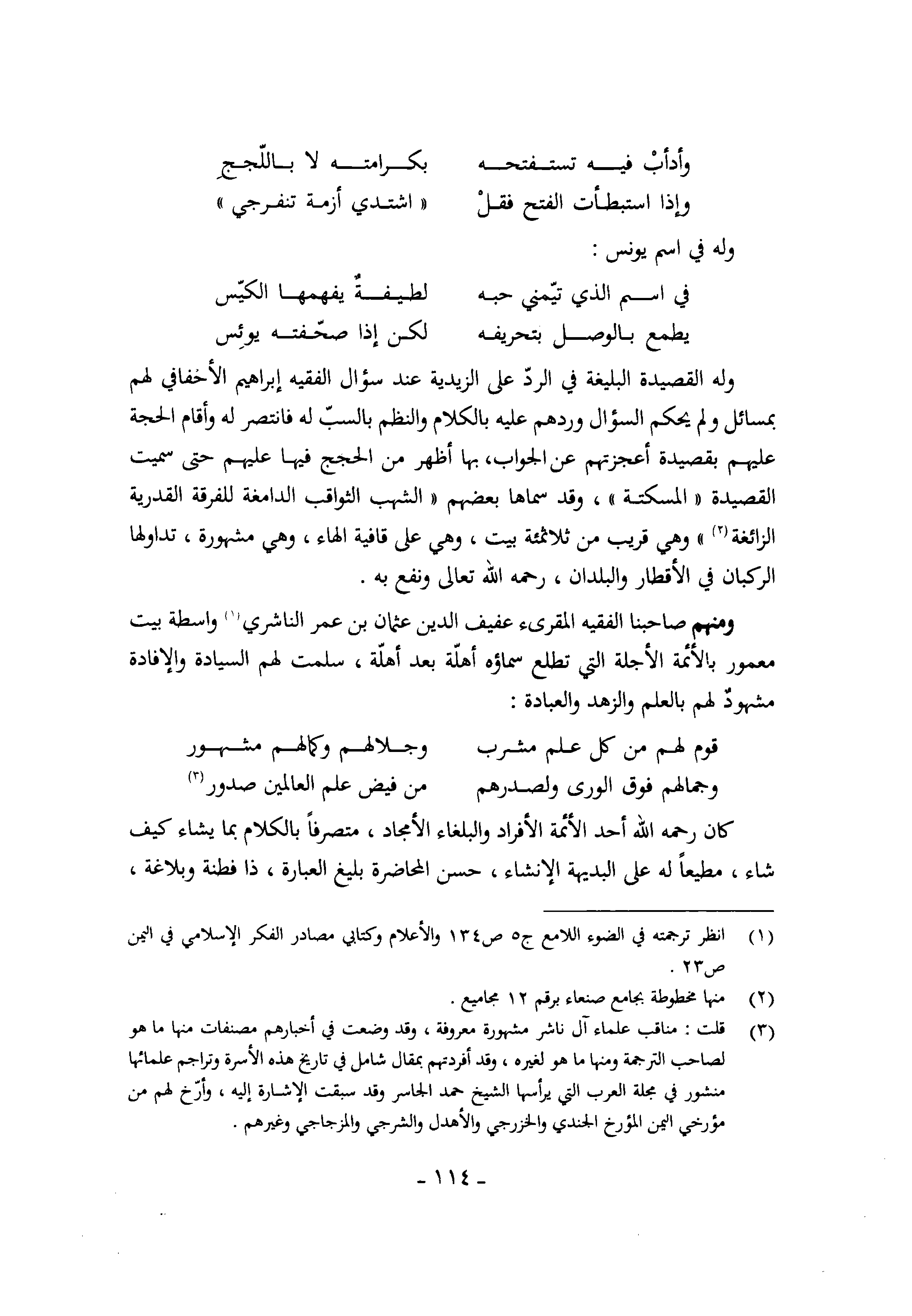 وَمِنْهُم صاحبنا الْفَقِيه المقرىء عفيف الدّين عُثْمَان بن عمر النَّاشِرِيّ وَاسِطَة بَيت معمور بالأئمة الأجلة الَّتِي تطلع سماؤه أهلة بعد أهلة سلمت لَهُم السِّيَادَة والإفادة مشهود لَهُم بِالْعلمِ والزهد وَالْعِبَادَة