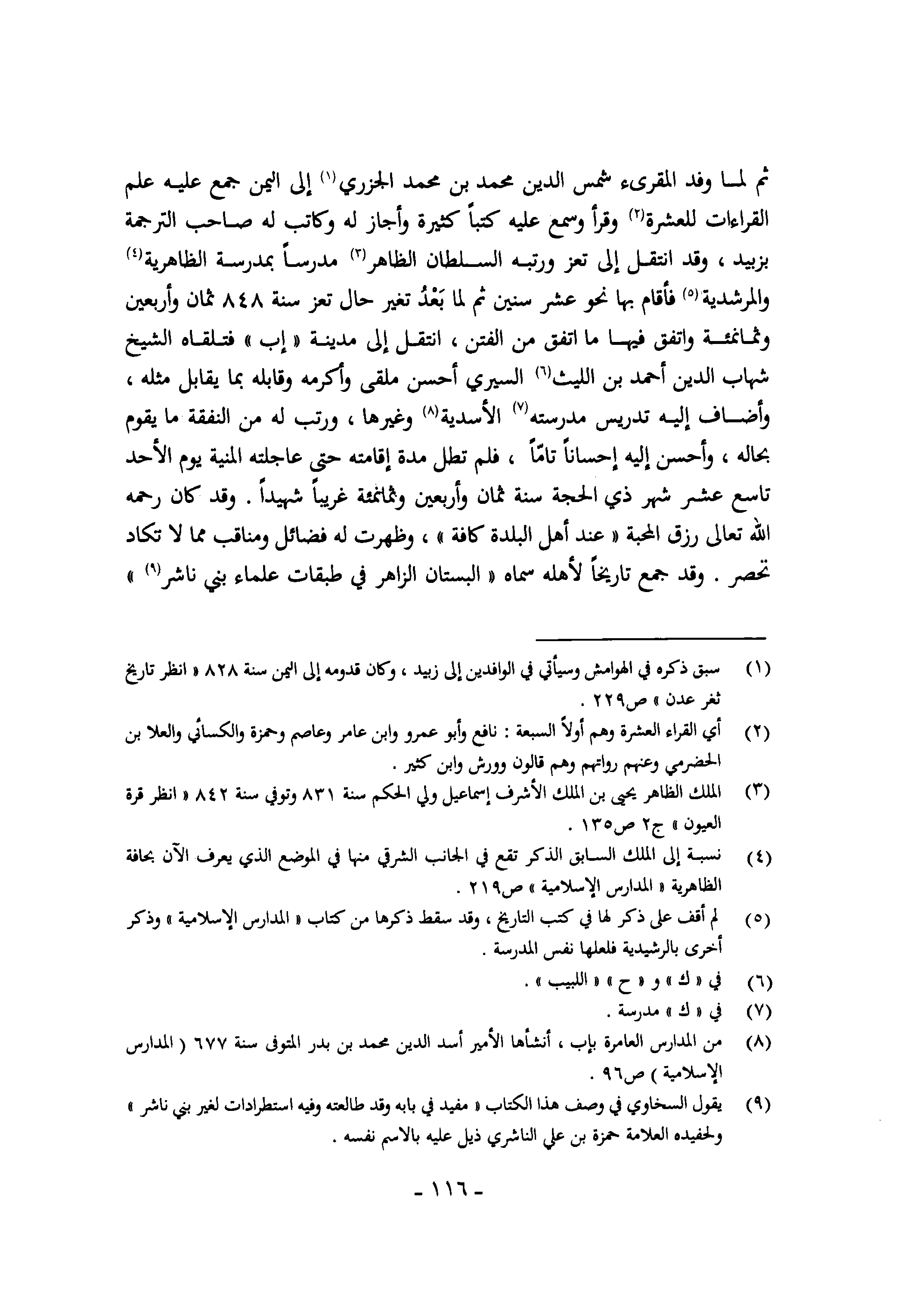 ثمَّ لما وَفد المقرىء شمس الدّين مُحَمَّد بن مُحَمَّد الْجَزرِي إِلَى الْيمن جمع عَلَيْهِ علم الْقرَاءَات للعشرة وَقَرَأَ وَسمع عَلَيْهِ كتبا كَثِيرَة واجاز لَهُ وَكَاتب لَهُ صَاحب التَّرْجَمَة بزبيد وَقد انْتقل إِلَى تعز ورتبه السُّلْطَان الظَّاهِر مدرسا بمدرسة الظَّاهِرِيَّة والمرشدية فَأَقَامَ بهَا نَحْو عشر سِنِين ثمَّ لما بعد تغير حَال تعز سنة 848 ثَمَان وَأَرْبَعين وثمانمئة وَاتفقَ فِيهَا مَا اتّفق من الْفِتَن انْتقل إِلَى مَدِينَة إب فَتَلقاهُ الشَّيْخ شهَاب الدّين أَحْمد بن اللَّيْث السيري أحسن ملقى وأكرمه وقابله بِمَا يُقَابل مثله واضاف إِلَيْهِ تدريس مدرسته الأَسدِية وَغَيرهَا ورتب لَهُ من النَّفَقَة مَا يقوم بِحَالهِ وَأحسن إِلَيْهِ إحسانا تَاما فَلم تطل مُدَّة إِقَامَته حَتَّى عاجلته الْمنية يَوْم الْأَحَد تَاسِع عشر شهر ذِي الْحجَّة سنة ثَمَان وَأَرْبَعين وثمانمئة غَرِيبا شَهِيدا وَقد كَانَ رَحمَه الله تَعَالَى رزق الْمحبَّة عِنْد أهل الْبَلدة كَافَّة وَظَهَرت لَهُ فَضَائِل ومناقب مِمَّا لَا تكَاد تحصر وَقد جمع تَارِيخا لأَهله سَمَّاهُ الْبُسْتَان الزَّاهِر فِي طَبَقَات عُلَمَاء بني ناشر