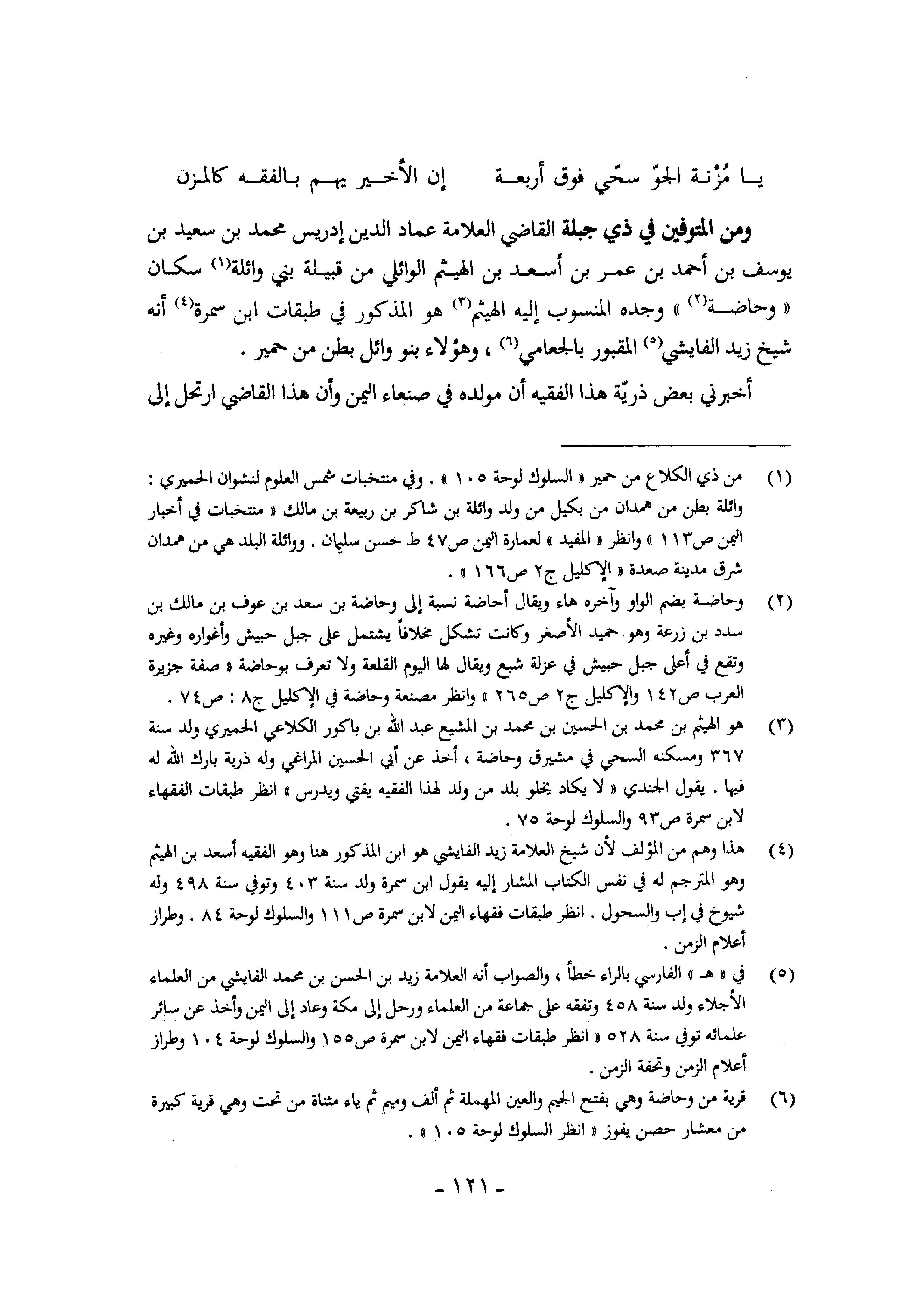وَمن المتوفين فِي ذِي جبلة القَاضِي الْعَلامَة عماد الدّين إِدْرِيس مُحَمَّد بن سعيد بن يُوسُف بن أَحْمد بن عمر بن أسعد بن الْهَيْثَم الوائلي من قَبيلَة بني وائلة سكان وحاضة وجده الْمَنْسُوب إِلَيْهِ الْهَيْثَم هُوَ الْمَذْكُور فِي طَبَقَات ابْن سَمُرَة أَنه شيخ زيد الفايشي المقبور بالجعامي وَهَؤُلَاء بَنو وَائِل بطن من حمير
