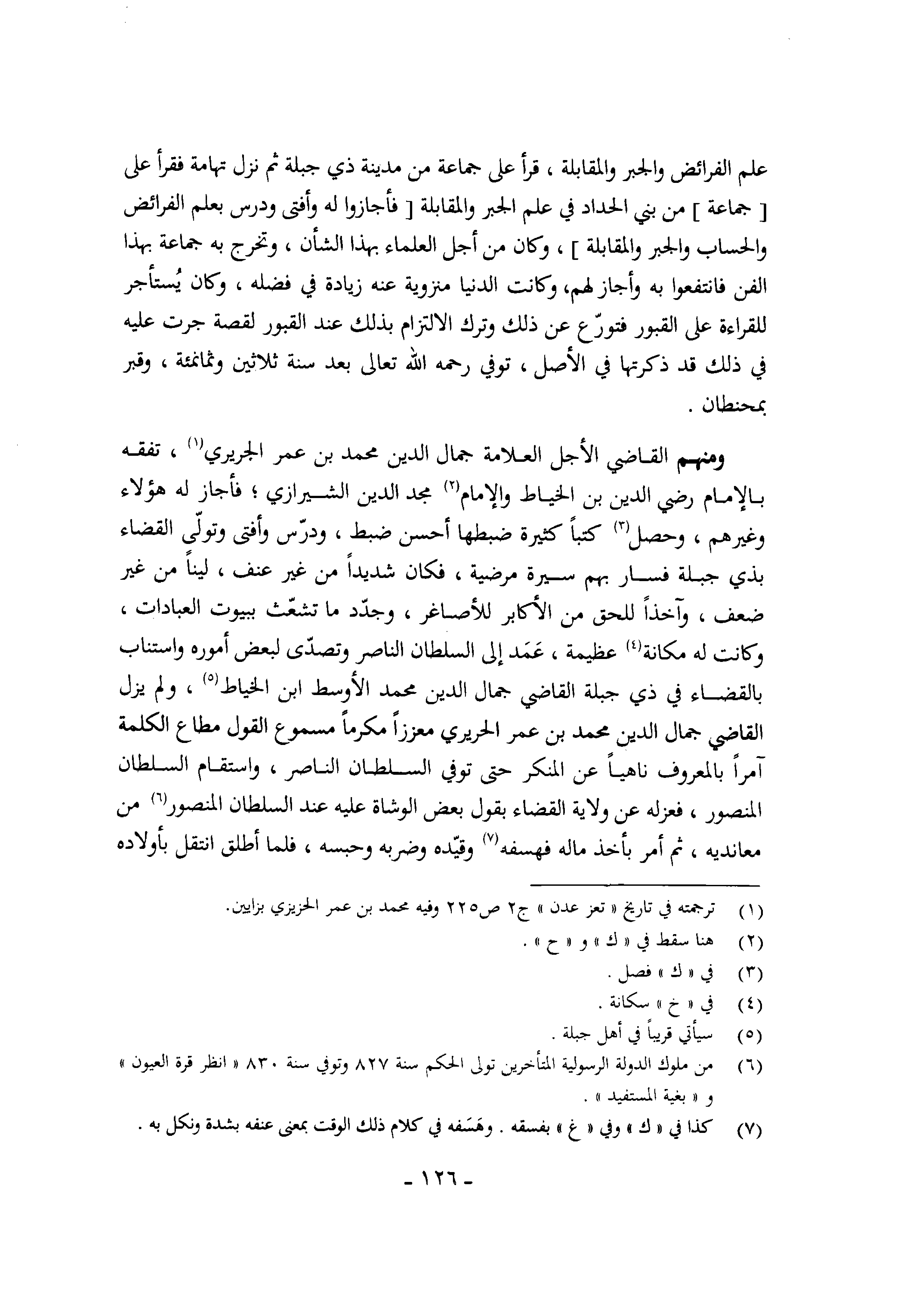 وَمِنْهُم القَاضِي الْأَجَل الْعَلامَة جمال الدّين مُحَمَّد بن عمر الْجريرِي تفقه بِالْإِمَامِ رَضِي الدّين بن الْخياط وَالْإِمَام مجد الدّين الشِّيرَازِيّ فَأجَاز لَهُ هَؤُلَاءِ وَغَيرهم وَحصل كتبا كَثِيرَة ضَبطهَا أحسن ضبط ودرس وَأفْتى وَتَوَلَّى الْقَضَاء بِذِي جبلة فَسَار بهم سيرة مرضية فَكَانَ شَدِيدا من غير عنف لينًا من غير ضعف وآخذا للحق من الأكابر للأصاغر وجدد مَا تشعث ببيوت الْعِبَادَات وَكَانَت لَهُ مكانة عَظِيمَة عمد إِلَى السُّلْطَان النَّاصِر وتصدى لبَعض أُمُوره واستناب بِالْقضَاءِ فِي ذِي جبلة القَاضِي جمال الدّين مُحَمَّد الْأَوْسَط ابْن الْخياط وَلم يزل القَاضِي جمال الدّين مُحَمَّد بن عمر الحريري معززا مكرما مسموع القَوْل مُطَاع الْكَلِمَة آمرا بِالْمَعْرُوفِ ناهيا عَن الْمُنكر حَتَّى توفّي السُّلْطَان النَّاصِر واستقام السُّلْطَان الْمَنْصُور فَعَزله عَن ولَايَة الْقَضَاء بقول بعض الوشاة عَلَيْهِ عِنْد السُّلْطَان الْمَنْصُور من معانديه ثمَّ أَمر بِأخذ مَاله فهسفه وَقَيده وضربه وحبسه فَلَمَّا أطلق انْتقل بأولاده