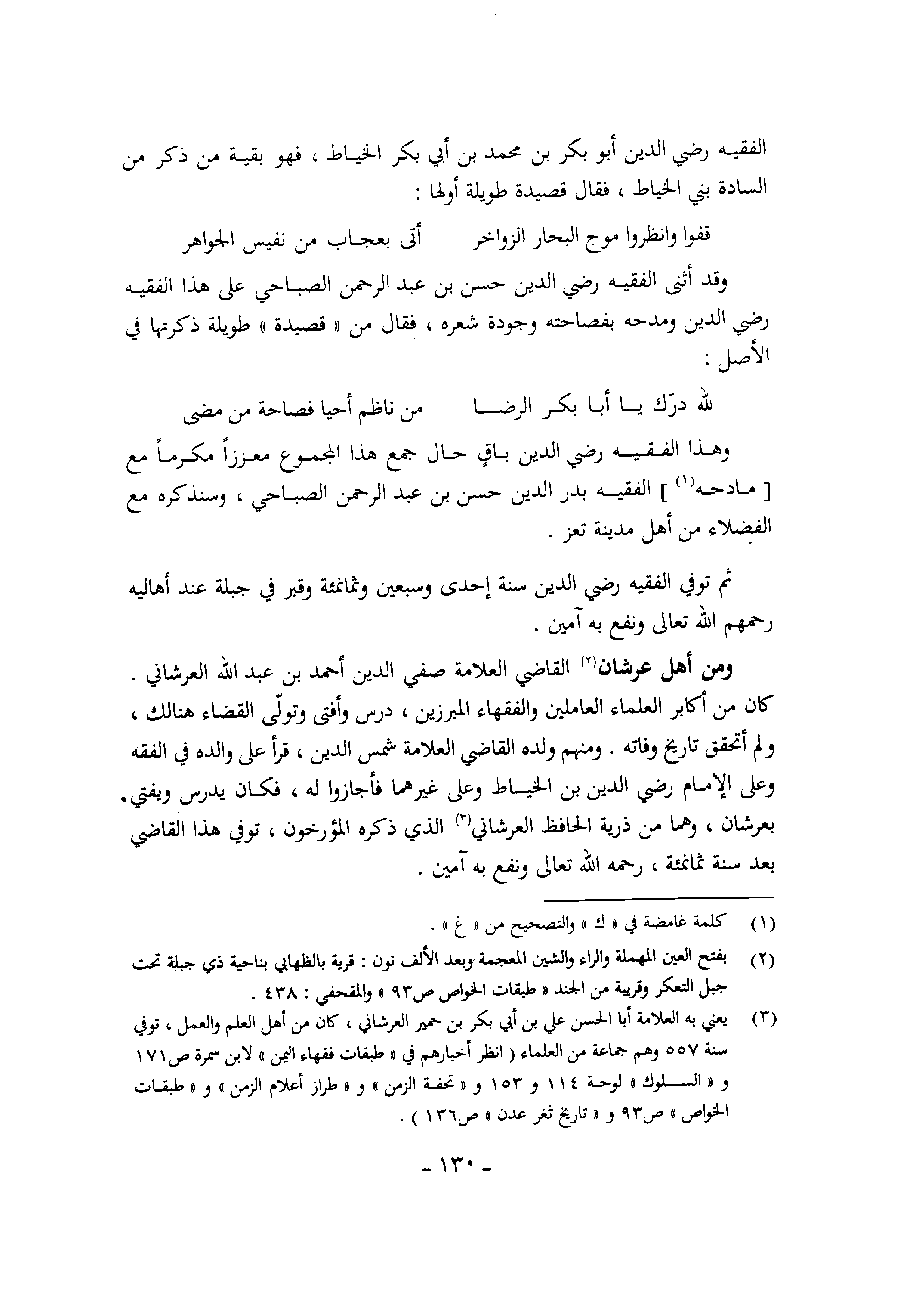 وَمن أهل عرشان القَاضِي الْعَلامَة صفي الدّين أَحْمد بن عبد الله العرشاني كَانَ من أكَابِر الْعلمَاء العاملين وَالْفُقَهَاء المبرزين درس وَأفْتى وَتَوَلَّى الْقَضَاء هُنَالك وَلم أتحقق تَارِيخ وَفَاته وَمِنْهُم وَلَده القَاضِي الْعَلامَة شمس الدّين قَرَأَ على وَالِده فِي الْفِقْه وعَلى الإِمَام رَضِي الدّين بن الْخياط وعَلى غَيرهمَا فأجازوا لَهُ فَكَانَ يدرس ويفتي بعرشان وهما من ذُرِّيَّة الْحَافِظ العرشاني الَّذِي ذكره المؤرخون توفّي هَذَا القَاضِي بعد سنة ثمانمئة رَحمَه الله تَعَالَى ونفع بِهِ آمين