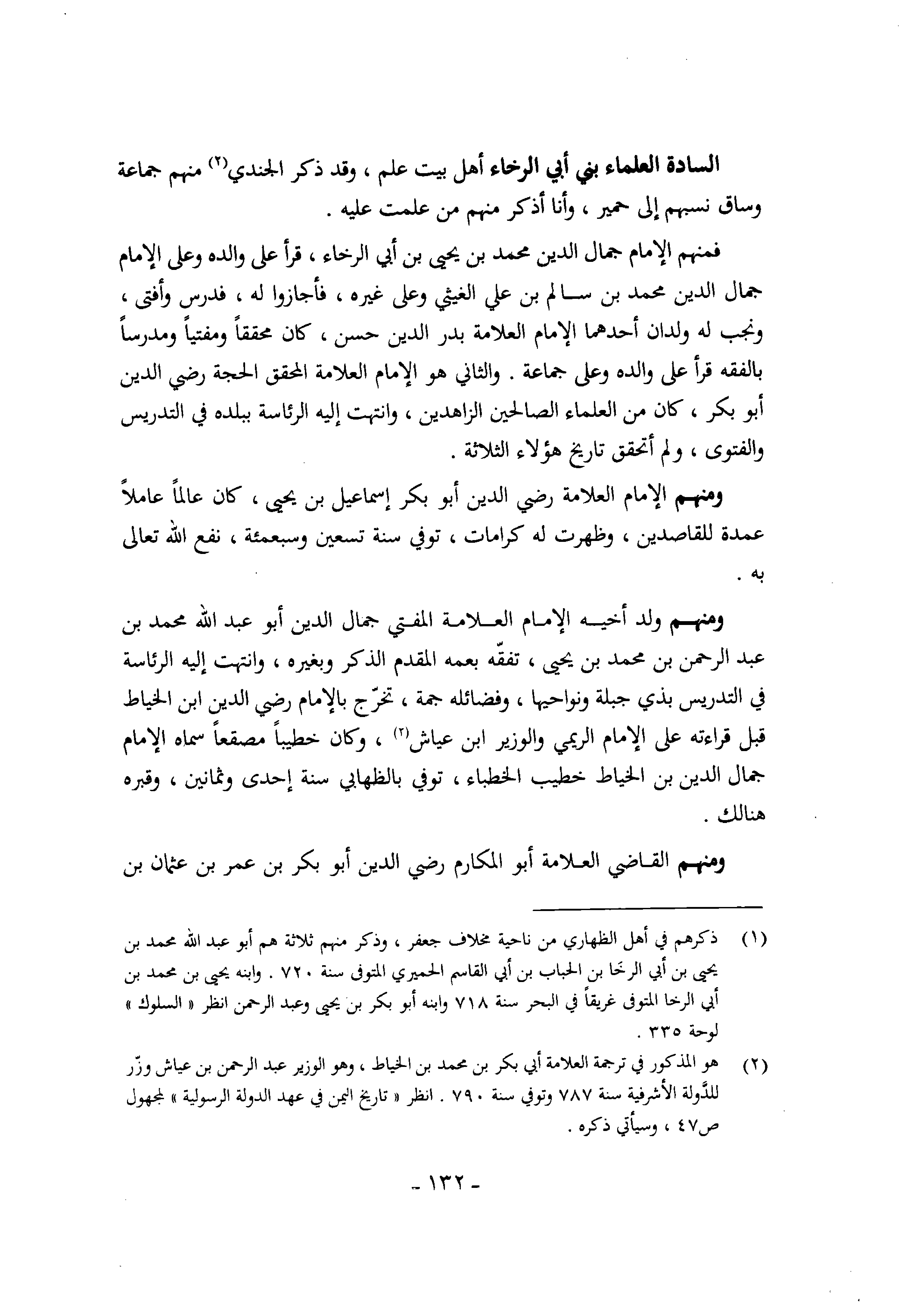 السَّادة الْعلمَاء بني أبي الرخَاء أهل بَيت علم وَقد ذكر الجندي مِنْهُم جمَاعَة وسَاق نسبهم إِلَى حمير وَأَنا أذكر مِنْهُم من علمت عَلَيْهِ