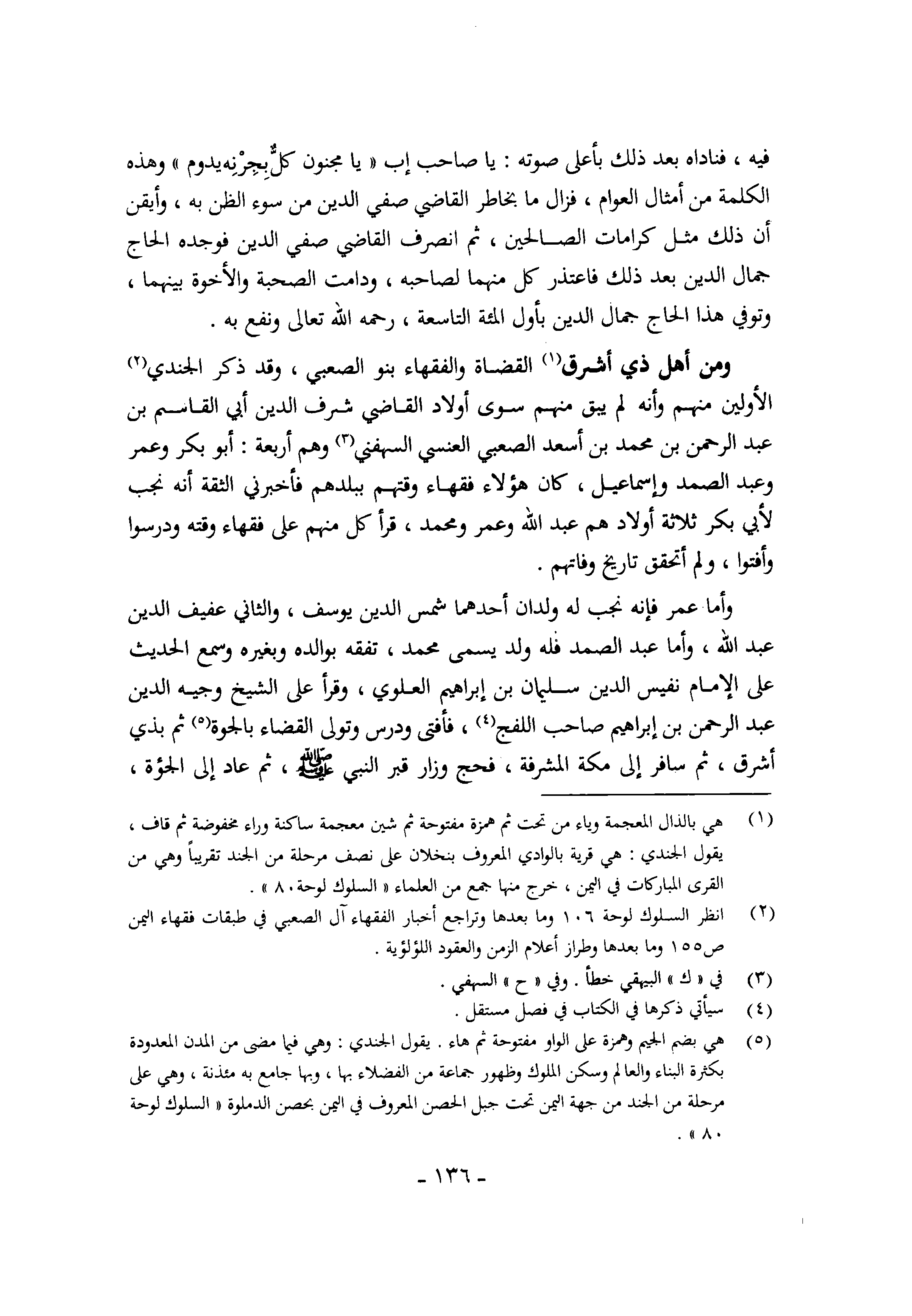 فِيهِ فناداه بعد ذَلِك بِأَعْلَى صَوته يَا صَاحب إب يَا مَجْنُون كل بجرنه يَدُوم وَهَذِه الْكَلِمَة من أَمْثَال الْعَوام فَزَالَ مَا بخاطر القَاضِي صفي الدّين من سوء الظَّن بِهِ وأيقن أَن ذَلِك مثل كرامات الصَّالِحين ثمَّ انْصَرف القَاضِي صفي الدّين فَوَجَدَهُ الْحَاج جمال الدّين بعد ذَلِك فَاعْتَذر كل مِنْهُمَا لصَاحبه ودامت الصُّحْبَة والأخوة بَينهمَا وَتُوفِّي هَذَا الْحَاج جمال الدّين بِأول المئة التَّاسِعَة رَحمَه الله تَعَالَى ونفع بِهِ