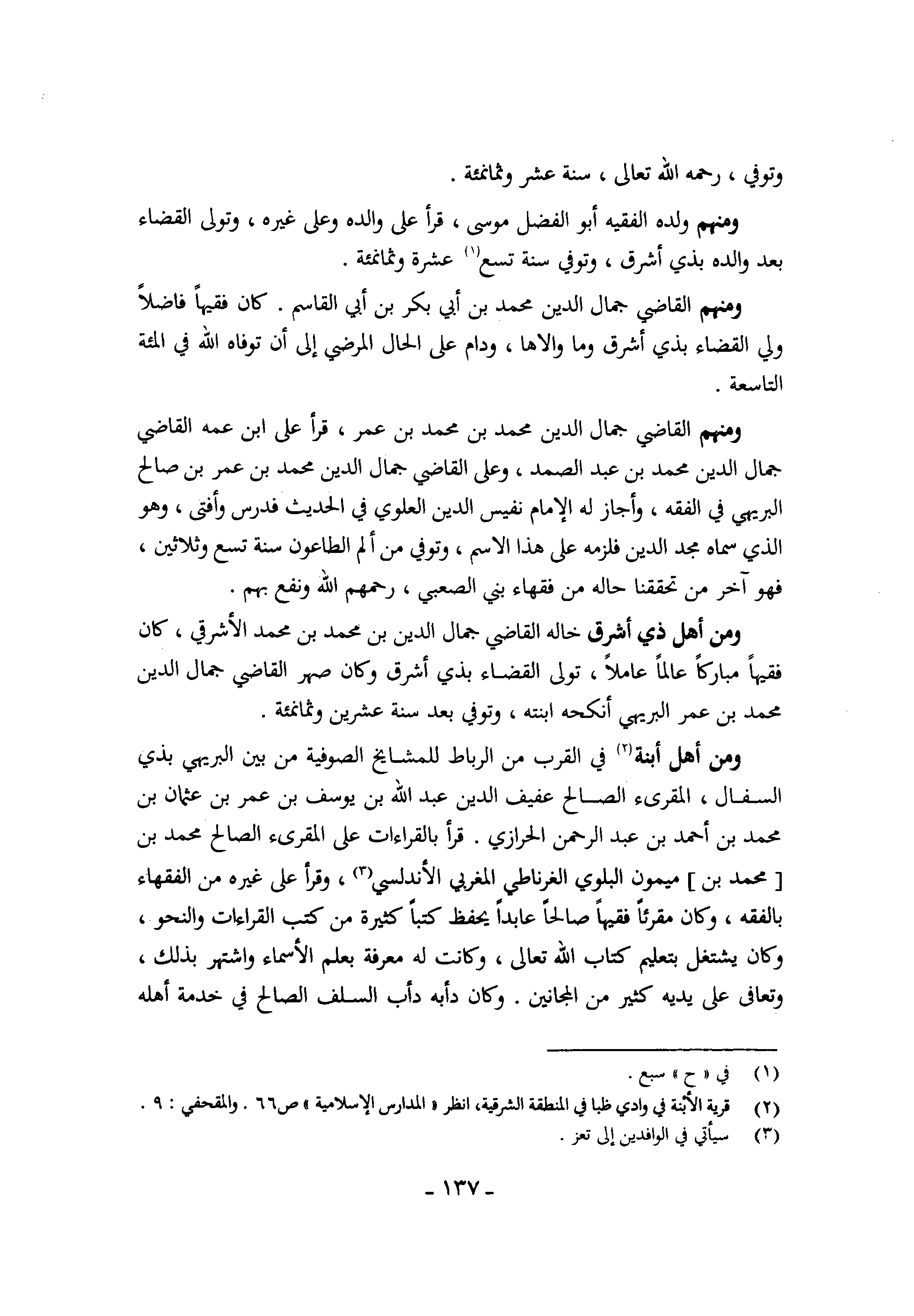 وَمِنْهُم القَاضِي جمال الدّين مُحَمَّد بن أبي بكر بن أبي الْقَاسِم كَانَ فَقِيها فَاضلا ولي الْقَضَاء بِذِي أشرق وَمَا والاها ودام على الْحَال المرضي إِلَى أَن توفاه الله فِي المئة التَّاسِعَة