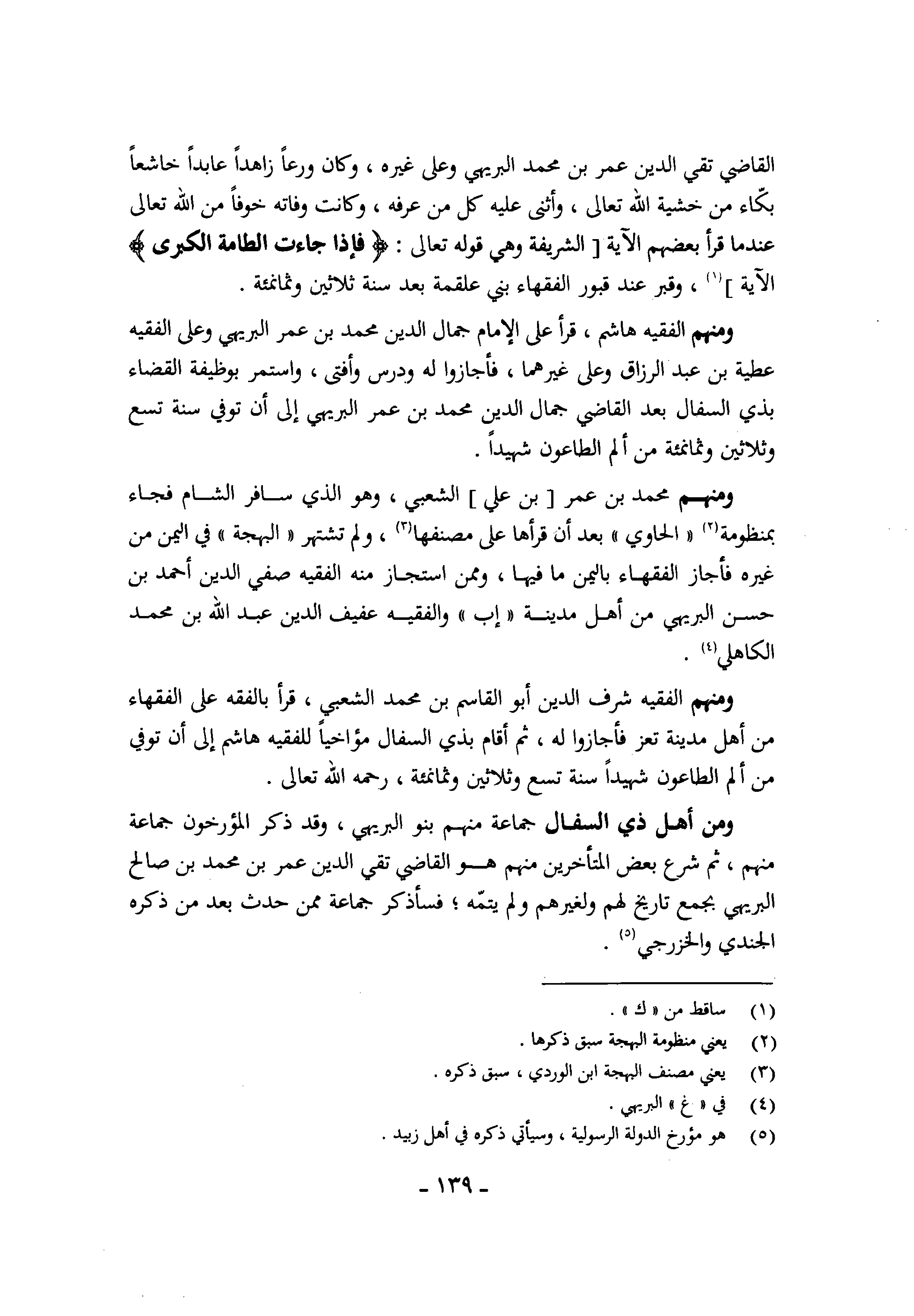 وَمن أهل ذِي السفال جمَاعَة مِنْهُم بَنو البريهي وَقد ذكر المؤرخون جمَاعَة مِنْهُم ثمَّ شرع بعض الْمُتَأَخِّرين مِنْهُم هُوَ القَاضِي تَقِيّ الدّين عمر بن مُحَمَّد بن صَالح البريهي بِجمع تَارِيخ لَهُم ولغيرهم وَلم يتمه فسأذكر جمَاعَة مِمَّن حدث بعد من ذكره الجندي والخزرجي