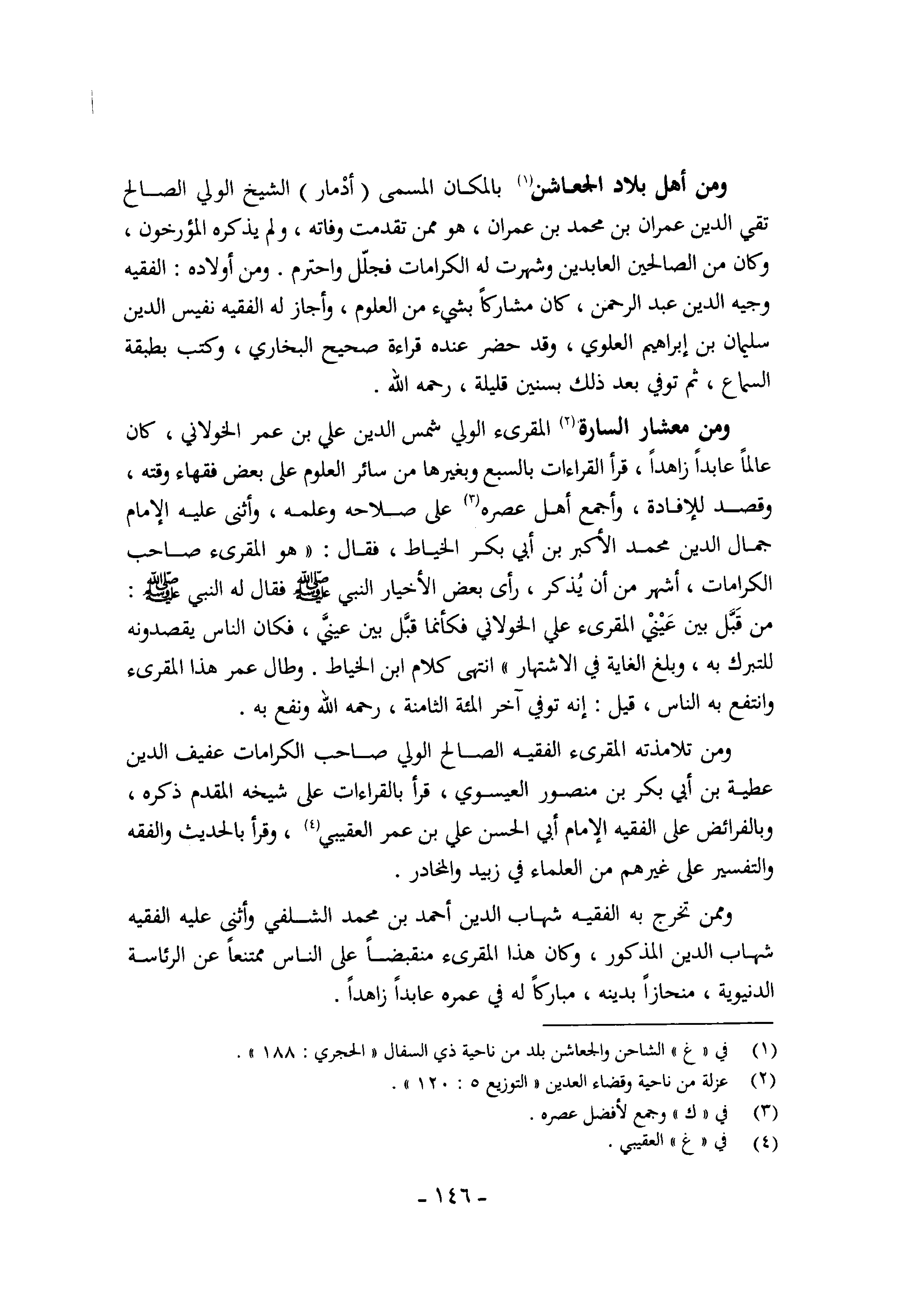 وَمن أهل بِلَاد الجعاشن بِالْمَكَانِ الْمُسَمّى أدمار الشَّيْخ الْوَلِيّ الصَّالح تَقِيّ الدّين عمرَان بن مُحَمَّد بن عمرَان هُوَ مِمَّن تقدّمت وَفَاته وَلم يذكرهُ المؤرخون وَكَانَ من الصَّالِحين العابدين وشهرت لَهُ الكرامات فجلل واحترم وَمن أَوْلَاده الْفَقِيه وجيه الدّين عبد الرَّحْمَن كَانَ مشاركا بِشَيْء من الْعُلُوم وَأَجَازَ لَهُ الْفَقِيه نَفِيس الدّين سُلَيْمَان بن إِبْرَاهِيم الْعلوِي وَقد حضر عِنْده قِرَاءَة صَحِيح البُخَارِيّ وَكتب بطبقة السماع ثمَّ توفّي بعد ذَلِك بسنين قَليلَة رَحمَه الله