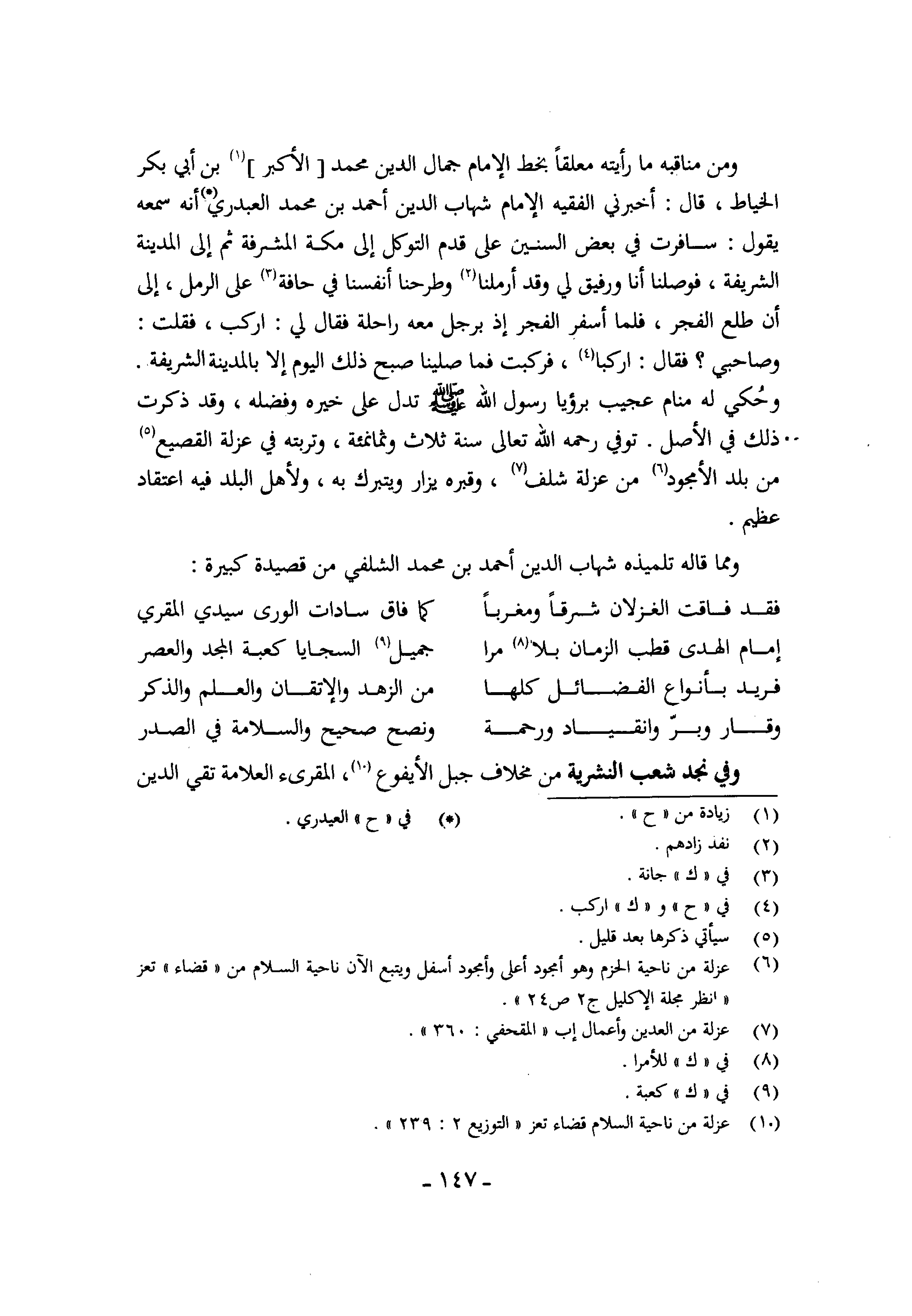 وَمن مناقبه مَا رَأَيْته مُعَلّقا بِخَط الإِمَام جمال الدّين مُحَمَّد الْأَكْبَر بن أبي بكر الْخياط قَالَ أَخْبرنِي الْفَقِيه الإِمَام شهَاب الدّين أَحْمد بن مُحَمَّد الْعَبدَرِي أَنه سَمعه يَقُول سَافَرت فِي بعض السنين على قدم التَّوَكُّل إِلَى مَكَّة المشرفة ثمَّ إِلَى الْمَدِينَة الشَّرِيفَة فوصلنا أَنا ورفيق لي وَقد أرملنا وطرحنا أَنْفُسنَا فِي حافة على الرمل إِلَى أَن طلع الْفجْر فَلَمَّا أَسْفر الْفجْر إِذْ بِرَجُل مَعَه رَاحِلَة فَقَالَ لي اركب فَقلت وصاحبي فَقَالَ اركبا فركبت فَمَا صلينَا صبح ذَلِك الْيَوْم إِلَّا بِالْمَدِينَةِ الشَّرِيفَة وَحكي لَهُ مَنَام عَجِيب برؤيا رَسُول الله صلى الله عَلَيْهِ وَسلم تدل على خَيره وفضله وَقد ذكرت ذَلِك فِي الأَصْل توفّي رَحمَه الله تَعَالَى سنة ثَلَاث وثمانمئة وتربته فِي عزلة القصيع من بلد الأمجود من عزلة شلف وقبره يزار ويتبرك بِهِ وَلأَهل الْبَلَد فِيهِ اعْتِقَاد عَظِيم