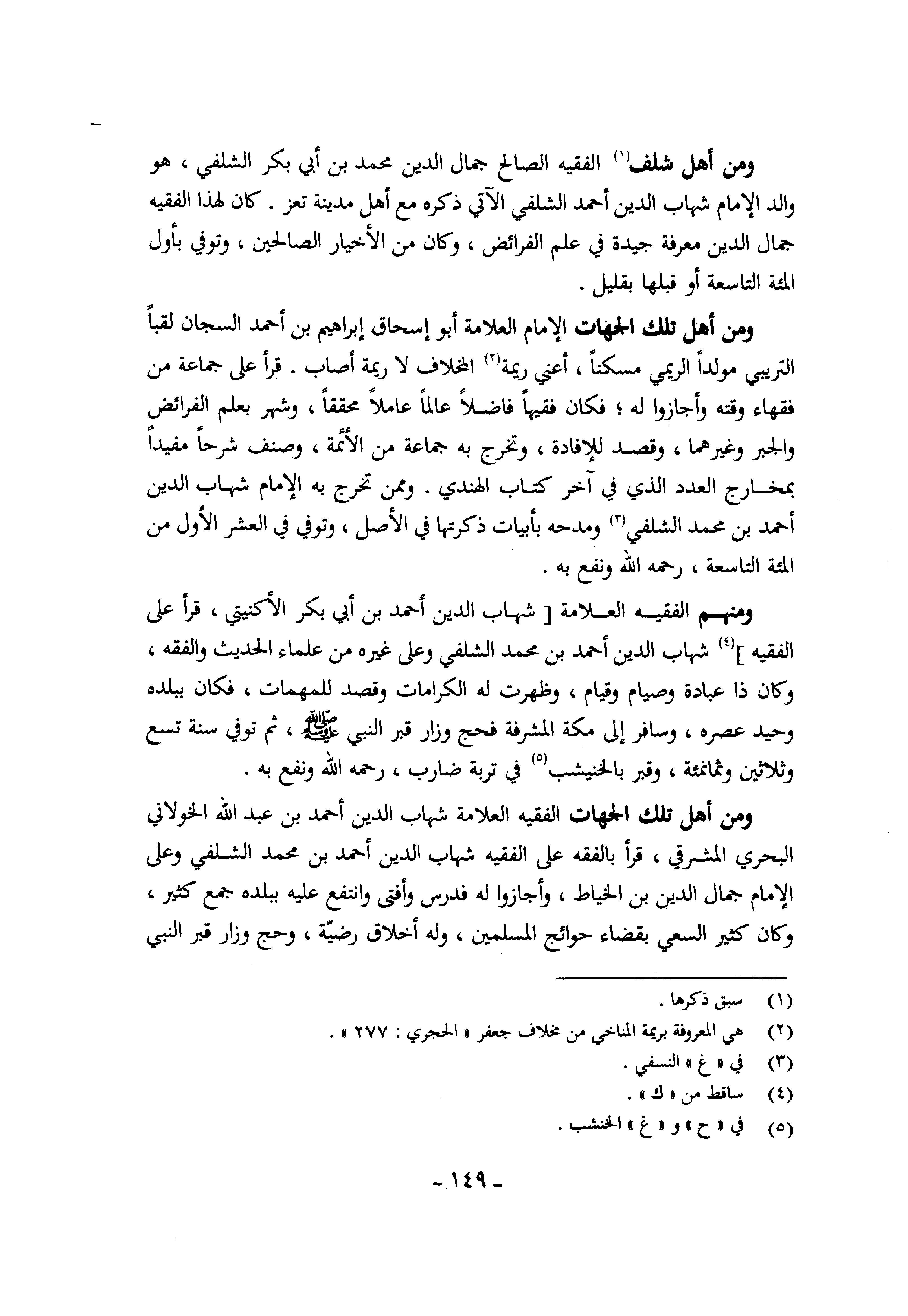 وَمن أهل شلف الْفَقِيه الصَّالح جمال الدّين مُحَمَّد بن أبي بكر الشلفي هُوَ وَالِد الإِمَام شهَاب الدّين أَحْمد الشلفي الْآتِي ذكره مَعَ أهل مَدِينَة تعز كَانَ لهَذَا الْفَقِيه جمال الدّين معرفَة جَيِّدَة فِي علم الْفَرَائِض وَكَانَ من الأخيار الصَّالِحين وَتُوفِّي بِأول المئة التَّاسِعَة أَو قبلهَا بِقَلِيل