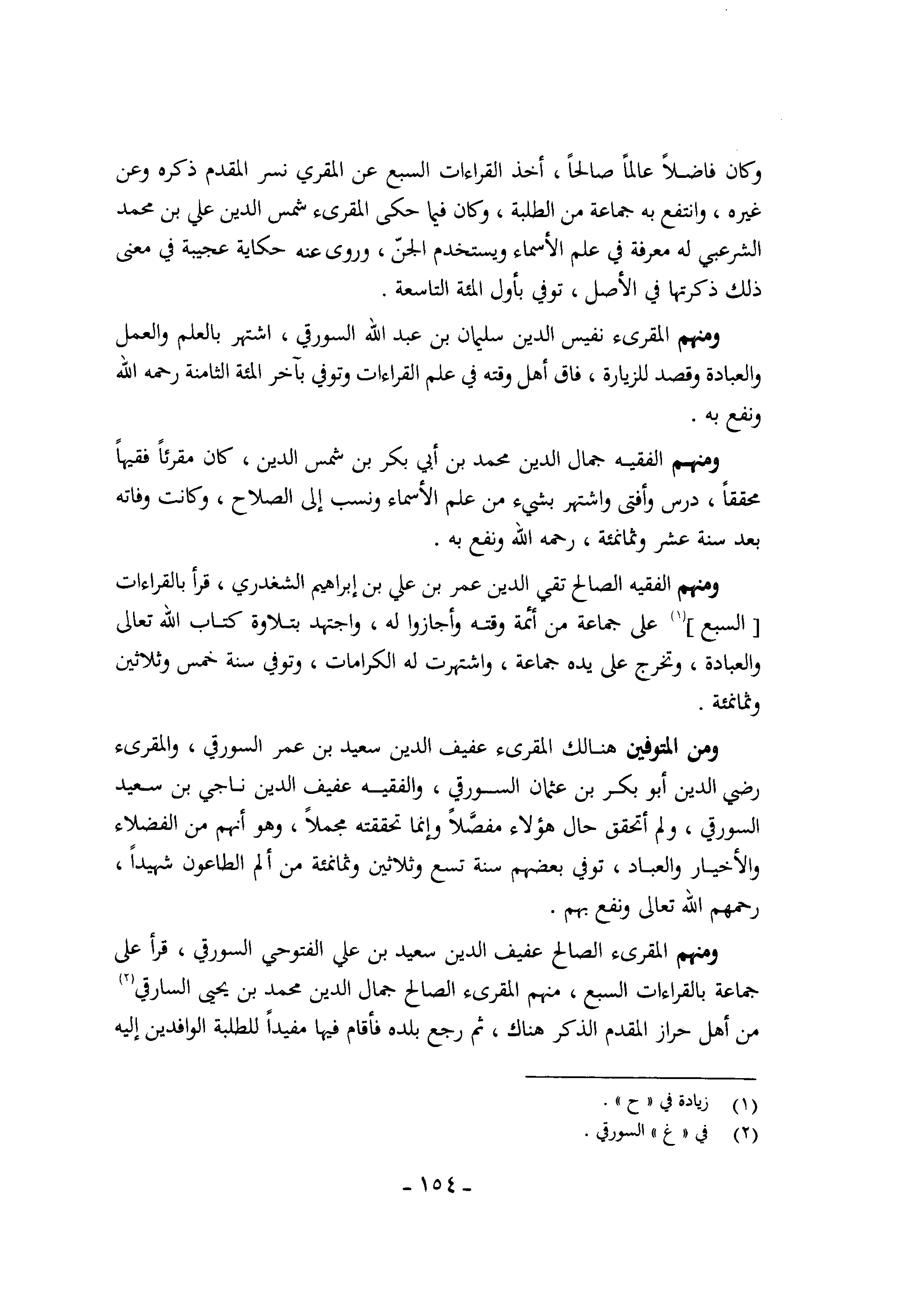 وَمِنْهُم المقرىء نَفِيس الدّين سُلَيْمَان بن عبد الله السورقي اشْتهر بِالْعلمِ وَالْعَمَل وَالْعِبَادَة وَقصد للزيارة فاق أهل وقته فِي علم الْقرَاءَات وَتُوفِّي بآخر المئة الثَّامِنَة رَحمَه الله ونفع بِهِ