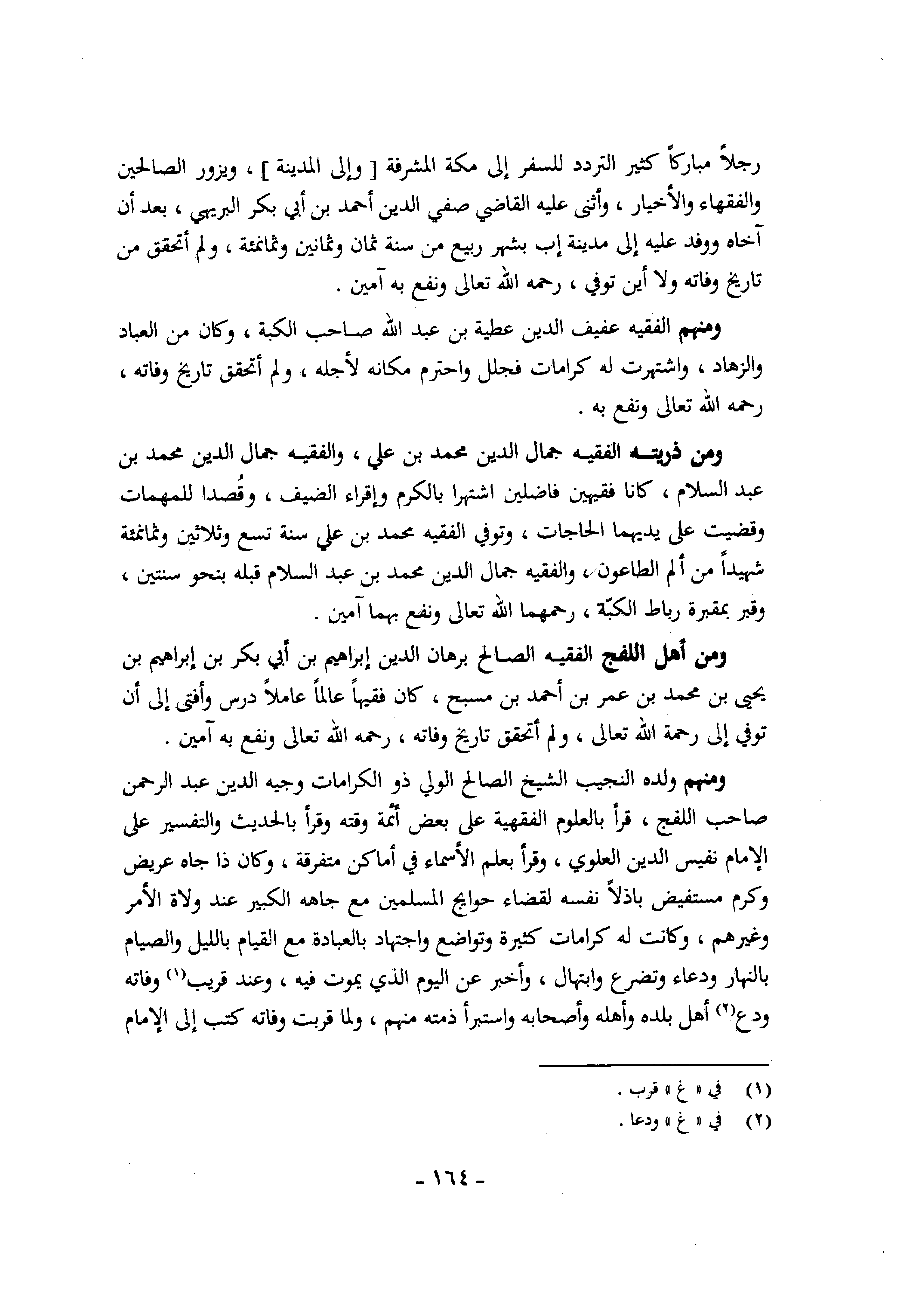 وَمن ذُريَّته الْفَقِيه جمال الدّين مُحَمَّد بن عَليّ والفقيه جمال الدّين مُحَمَّد بن عبد السَّلَام كَانَا فقيهين فاضلين اشتهرا بِالْكَرمِ وإقراء الضَّيْف وقصدا للمهمات وقضيت على يديهما الْحَاجَات وَتُوفِّي الْفَقِيه مُحَمَّد بن عَليّ سنة تسع وَثَلَاثِينَ وثمانمئة شَهِيدا من ألم الطَّاعُون والفقيه جمال الدّين مُحَمَّد بن عبد السَّلَام قبله بِنَحْوِ سنتَيْن وقبر بمقبرة رِبَاط الكبة رحمهمَا الله تَعَالَى ونفع بهما آمين