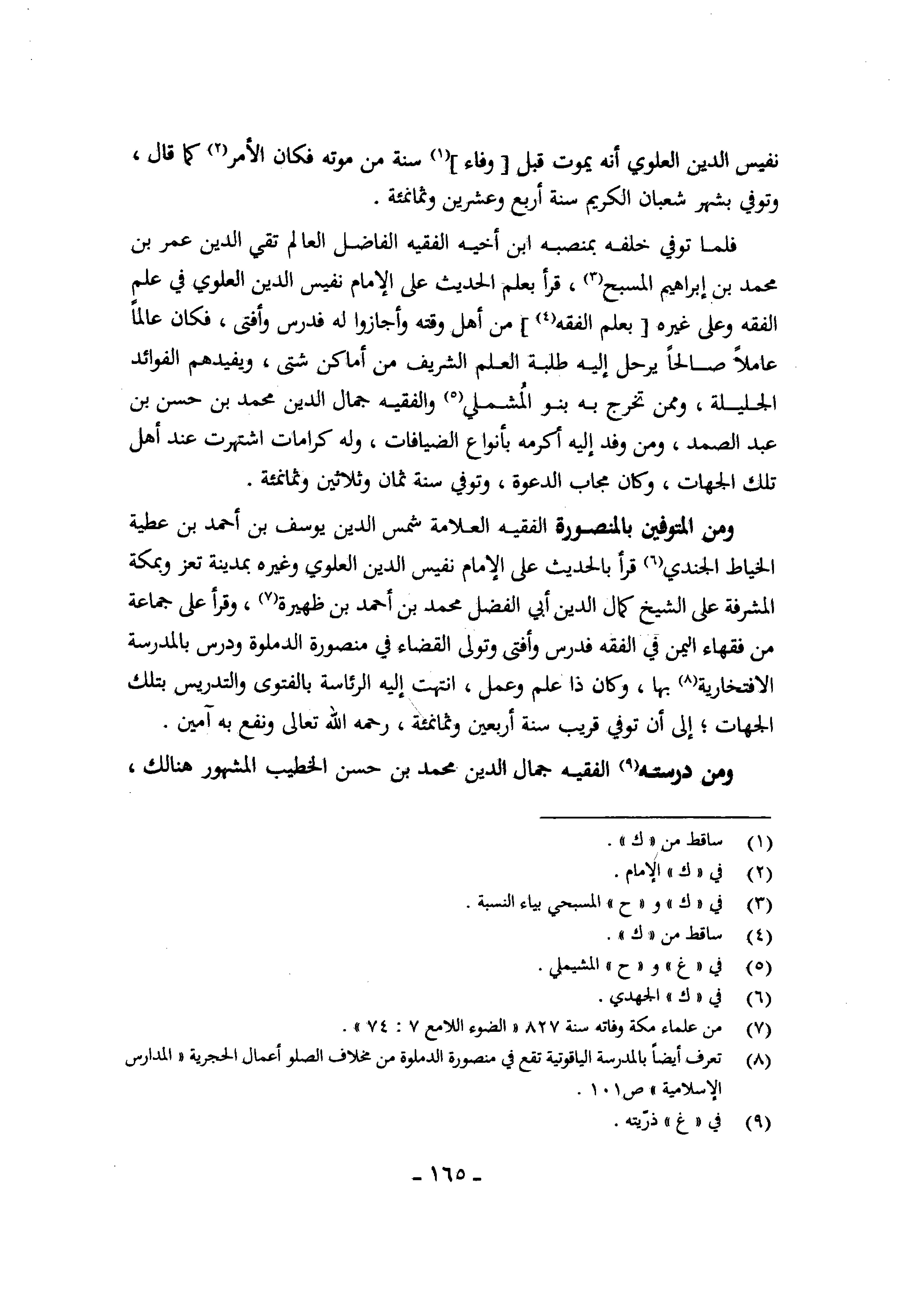 وَمن المتوفين بالمنصورة الْفَقِيه الْعَلامَة شمس الدّين يُوسُف بن أَحْمد بن عَطِيَّة الْخياط الجندي قَرَأَ بِالْحَدِيثِ على الإِمَام نَفِيس الدّين الْعلوِي وَغَيره بِمَدِينَة تعز وبمكة المشرفة على الشَّيْخ كَمَال الدّين أبي الْفضل مُحَمَّد بن أَحْمد بن ظهيرة وَقَرَأَ على جمَاعَة من فُقَهَاء الْيمن فِي الْفِقْه فدرس وَأفْتى وَتَوَلَّى الْقَضَاء فِي منصورة الدملوة ودرس بِالْمَدْرَسَةِ الافتخارية بهَا وَكَانَ ذَا علم وَعمل انْتَهَت إِلَيْهِ الرِّئَاسَة بالفتوى والتدريس بِتِلْكَ الْجِهَات إِلَى أَن توفّي قريب سنة أَرْبَعِينَ وثمانمئة رَحمَه الله تَعَالَى ونفع بِهِ آمين