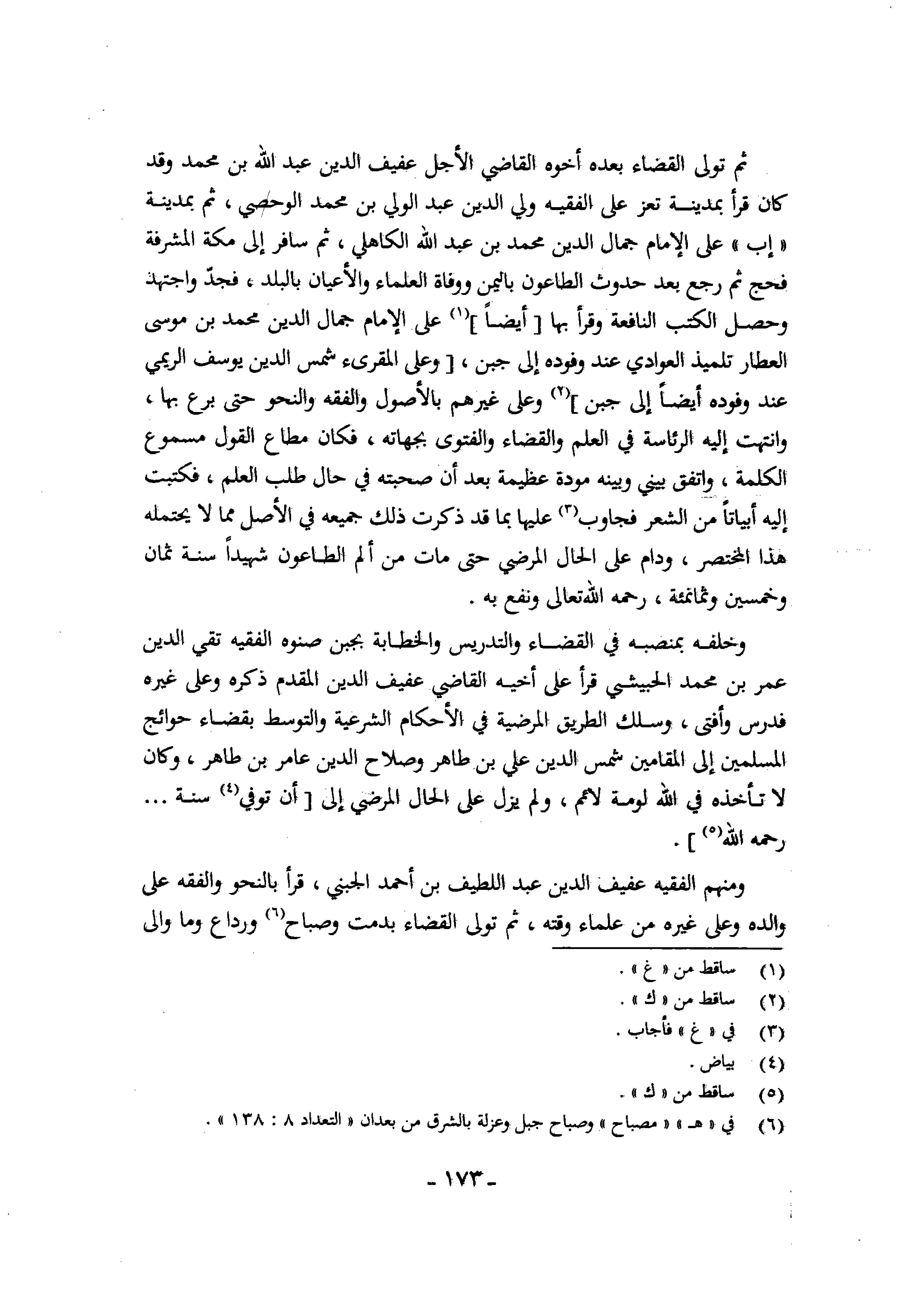 ثمَّ تولى الْقَضَاء بعده أَخُوهُ القَاضِي الْأَجَل عفيف الدّين عبد الله بن مُحَمَّد وَقد كَانَ قَرَأَ بِمَدِينَة تعز على الْفَقِيه ولي الدّين عبد الْوَلِيّ بن مُحَمَّد الوحصي ثمَّ بِمَدِينَة إب على الإِمَام جمال الدّين مُحَمَّد بن عبد الله الْكَاهِلِي ثمَّ سَافر إِلَى مَكَّة المشرفة فحج ثمَّ رَجَعَ بعد حُدُوث الطَّاعُون بِالْيمن ووفاة الْعلمَاء والأعيان بِالْبَلَدِ فجد واجتهد وَحصل الْكتب النافعة وَقَرَأَ بهَا أَيْضا على الإِمَام جمال الدّين مُحَمَّد بن مُوسَى الْعَطَّار تلميذ العوادي عِنْد وفوده إِلَى جبن وعَلى المقرىء شمس الدّين يُوسُف الريمي عِنْد وفوده أَيْضا إِلَى جبن وعَلى غَيرهم بالأصول وَالْفِقْه والنحو حَتَّى برع بهَا وانتهت إِلَيْهِ الرِّئَاسَة فِي الْعلم وَالْقَضَاء وَالْفَتْوَى بجهاته فَكَانَ مُطَاع القَوْل مسموع الْكَلِمَة وَاتفقَ بيني وَبَينه مَوَدَّة عَظِيمَة بعد أَن صحبته فِي حَال طلب الْعلم فَكتبت إِلَيْهِ أبياتا من الشّعْر فجاوب عَلَيْهَا بِمَا قد ذكرت ذَلِك جَمِيعه فِي الأَصْل مِمَّا لَا يحْتَملهُ هَذَا الْمُخْتَصر ودام على الْحَال المرضي حَتَّى مَاتَ من ألم الطَّاعُون شَهِيدا سنة ثَمَان وَخمسين وثمانمئة رَحمَه الله تَعَالَى ونفع بِهِ