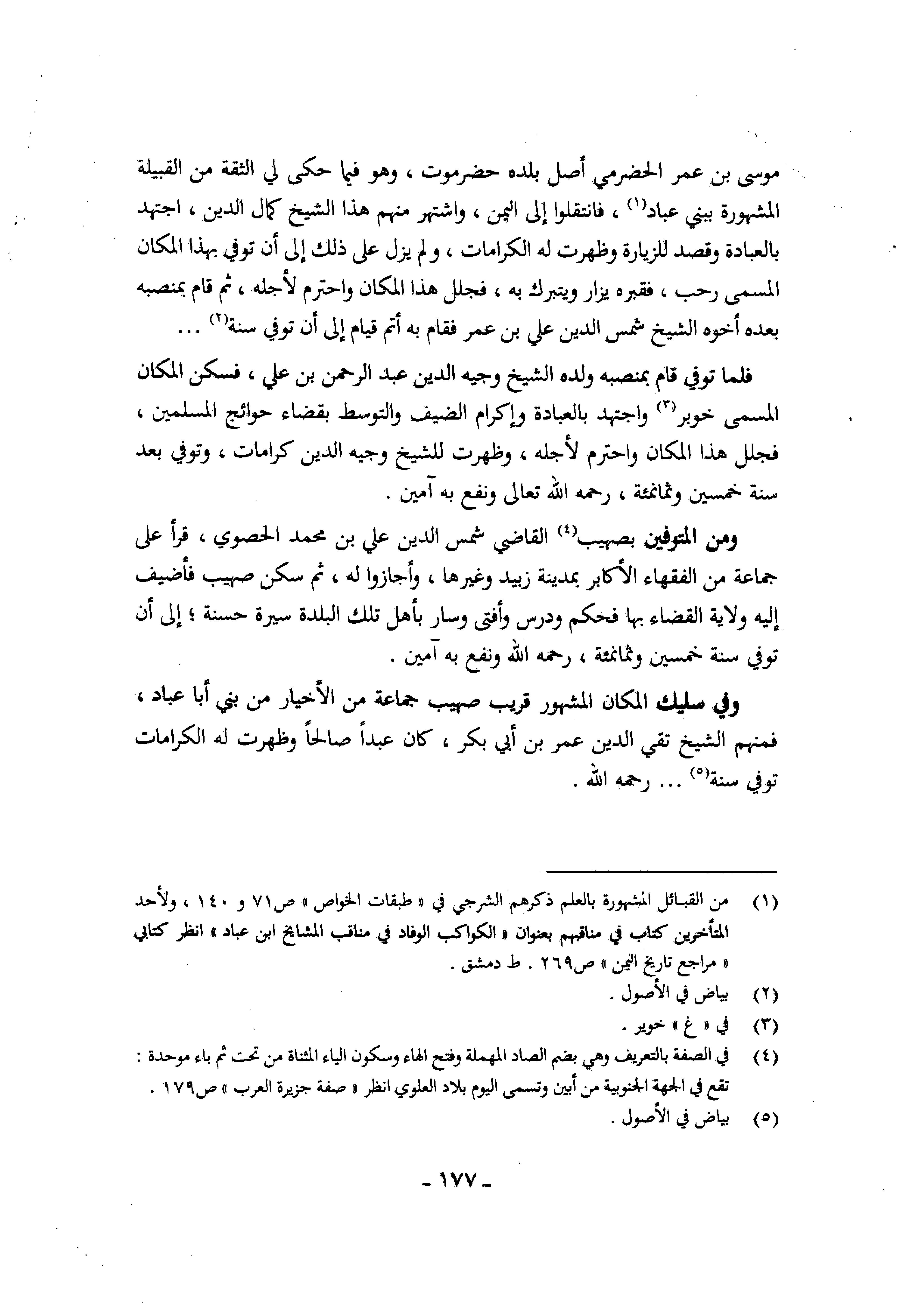 مُوسَى بن عمر الْحَضْرَمِيّ أصل بَلَده حَضرمَوْت وَهُوَ فِيمَا حكى لي الثِّقَة من الْقَبِيلَة الْمَشْهُورَة ببني عباد فانتقلوا إِلَى الْيمن واشتهر مِنْهُم هَذَا الشَّيْخ كَمَال الدّين اجْتهد بِالْعبَادَة وَقصد للزيارة وَظَهَرت لَهُ الكرامات وَلم يزل على ذَلِك إِلَى أَن توفّي بِهَذَا الْمَكَان الْمُسَمّى رحب فقبره يزار ويتبرك بِهِ فجلل هَذَا الْمَكَان واحترم لأَجله ثمَّ قَامَ بمنصبه بعده أَخُوهُ الشَّيْخ شمس الدّين عَليّ بن عمر فَقَامَ بِهِ أتم قيام إِلَى أَن توفّي سنة