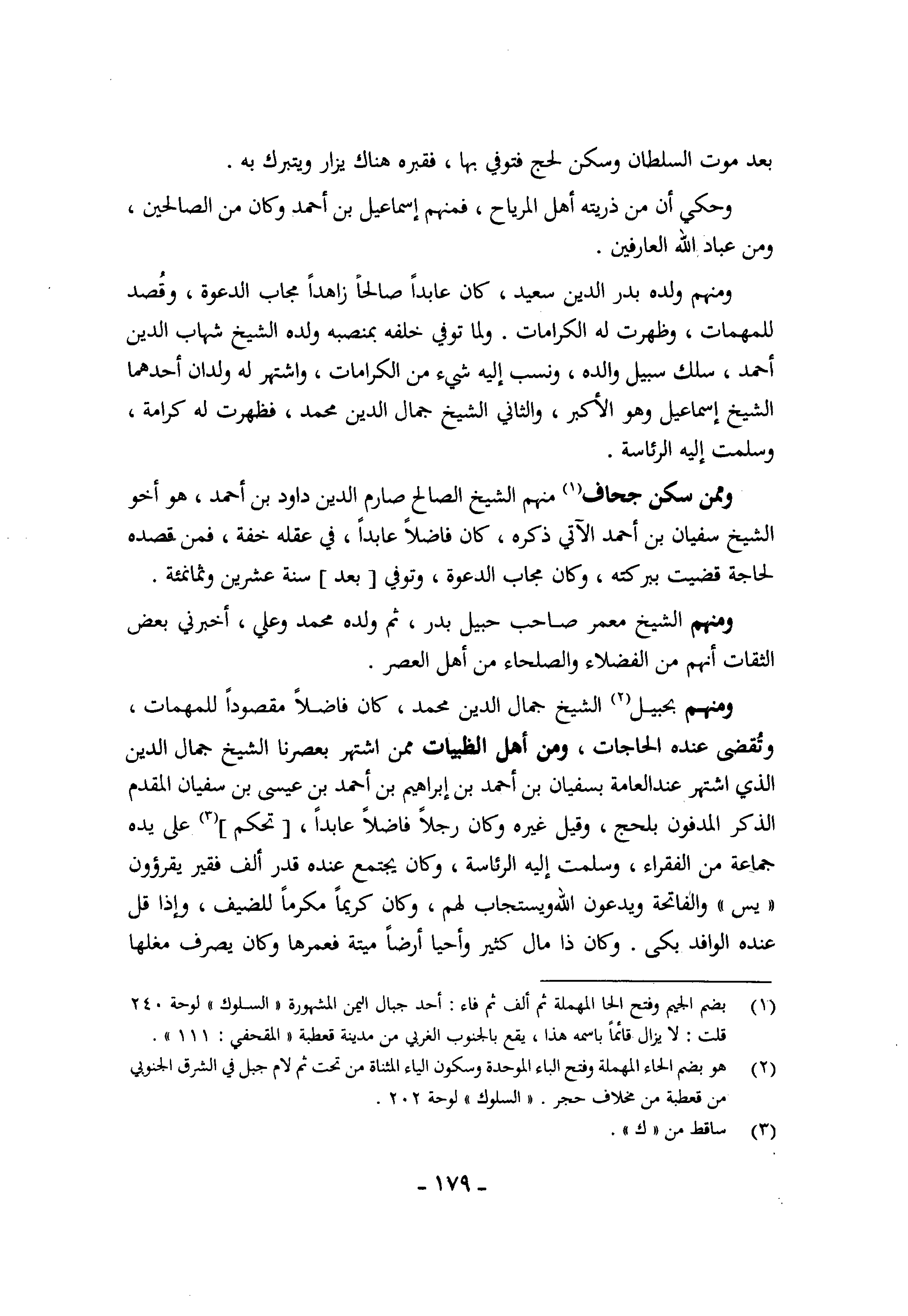 وَمِنْهُم وَلَده بدر الدّين سعيد كَانَ عابدا صَالحا زاهدا مجاب الدعْوَة وَقصد للمهمات وَظَهَرت لَهُ الكرامات وَلما توفّي خَلفه بمنصبه وَلَده الشَّيْخ شهَاب الدّين أَحْمد سلك سَبِيل وَالِده وَنسب إِلَيْهِ شَيْء من الكرامات واشتهر لَهُ ولدان أَحدهمَا الشَّيْخ إِسْمَاعِيل وَهُوَ الْأَكْبَر وَالثَّانِي الشَّيْخ جمال الدّين مُحَمَّد فظهرت لَهُ كَرَامَة وسلمت إِلَيْهِ الرِّئَاسَة
