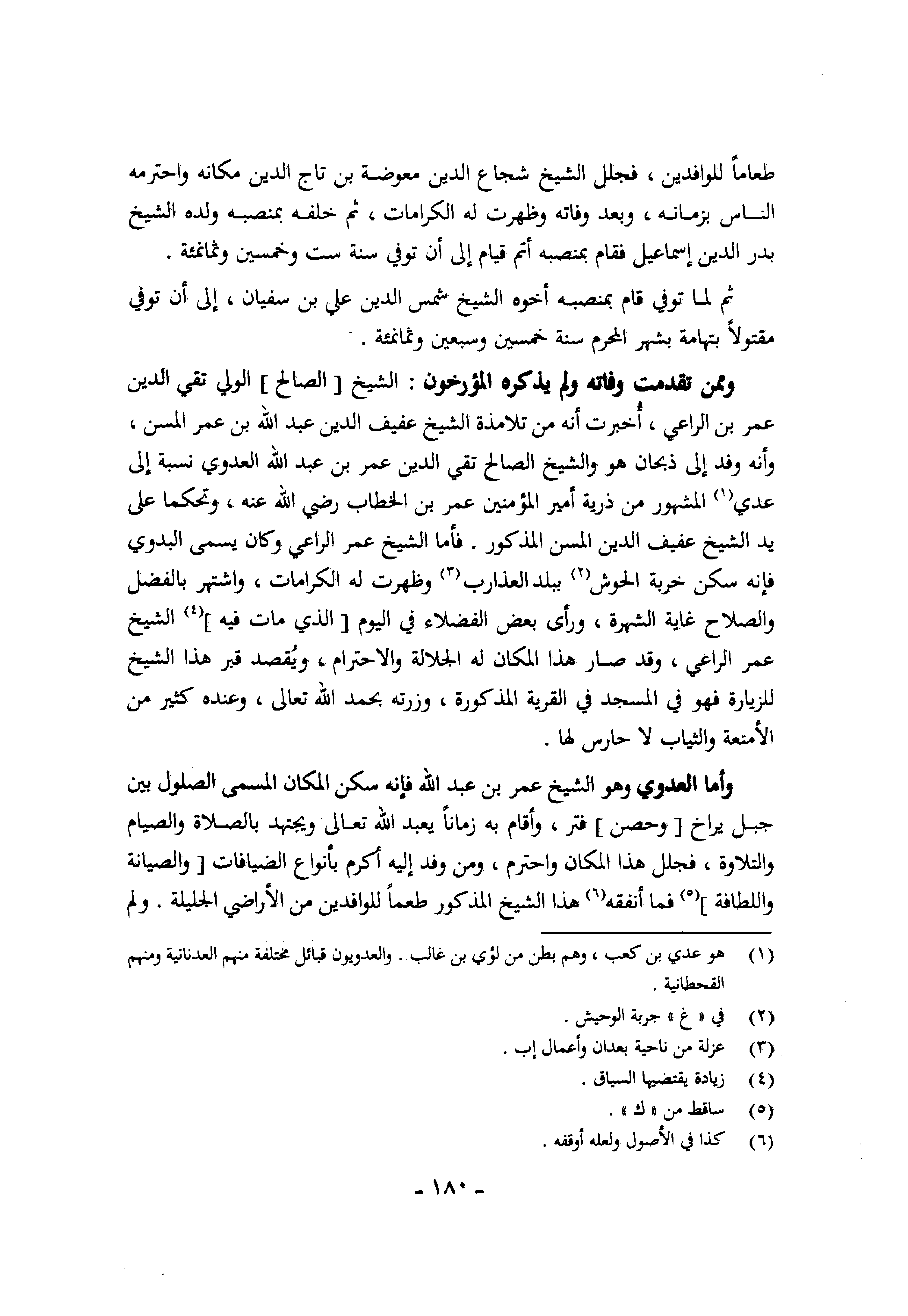 وَمِمَّنْ تقدّمت وَفَاته وَلم يذكرهُ المؤرخون الشَّيْخ الصَّالح الْوَلِيّ تَقِيّ الدّين عمر بن الرَّاعِي أخْبرت أَنه من تلامذة الشَّيْخ عفيف الدّين عبد الله بن عمر المسن وَأَنه وَفد إِلَى ذبحان هُوَ وَالشَّيْخ الصَّالح تَقِيّ الدّين عمر بن عبد الله الْعَدوي نِسْبَة إِلَى عدي الْمَشْهُور من ذُرِّيَّة أَمِير الْمُؤمنِينَ عمر بن الْخطاب رَضِي الله عَنهُ وتحكما على يَد الشَّيْخ عفيف الدّين المسن الْمَذْكُور فَأَما الشَّيْخ عمر الرَّاعِي وَكَانَ يُسمى البدوي فَإِنَّهُ سكن خربة الحوش بِبَلَد العذارب وَظَهَرت لَهُ الكرامات واشتهر بِالْفَضْلِ وَالصَّلَاح وَغَايَة الشُّهْرَة وَرَأى بعض الْفُضَلَاء فِي الْيَوْم الَّذِي مَاتَ فِيهِ الشَّيْخ عمر الرَّاعِي وَقد صَار هَذَا الْمَكَان لَهُ الْجَلالَة والاحترام ويقصد قبر هَذَا الشَّيْخ للزيارة فَهُوَ فِي الْمَسْجِد فِي الْقرْيَة الْمَذْكُورَة وزرته بِحَمْد الله تَعَالَى وَعِنْده كثير من الْأَمْتِعَة وَالثيَاب لَا حارس لَهَا