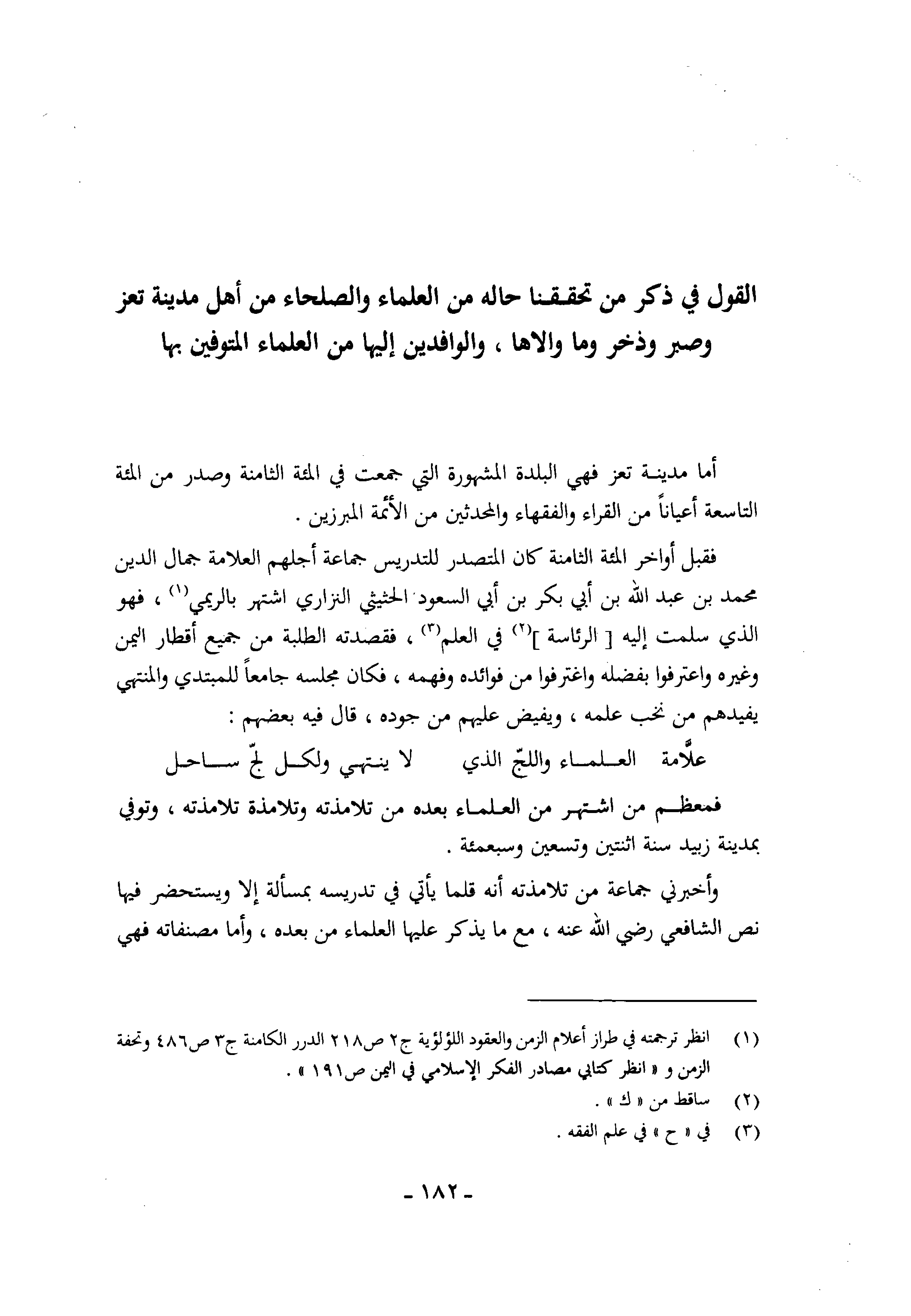 القَوْل فِي ذكر من تحققنا حَاله من الْعلمَاء والصلحاء من أهل مَدِينَة تعز وصبر وَذخر وَمَا والاها والوافدين إِلَيْهَا من الْعلمَاء المتوفين بهَا