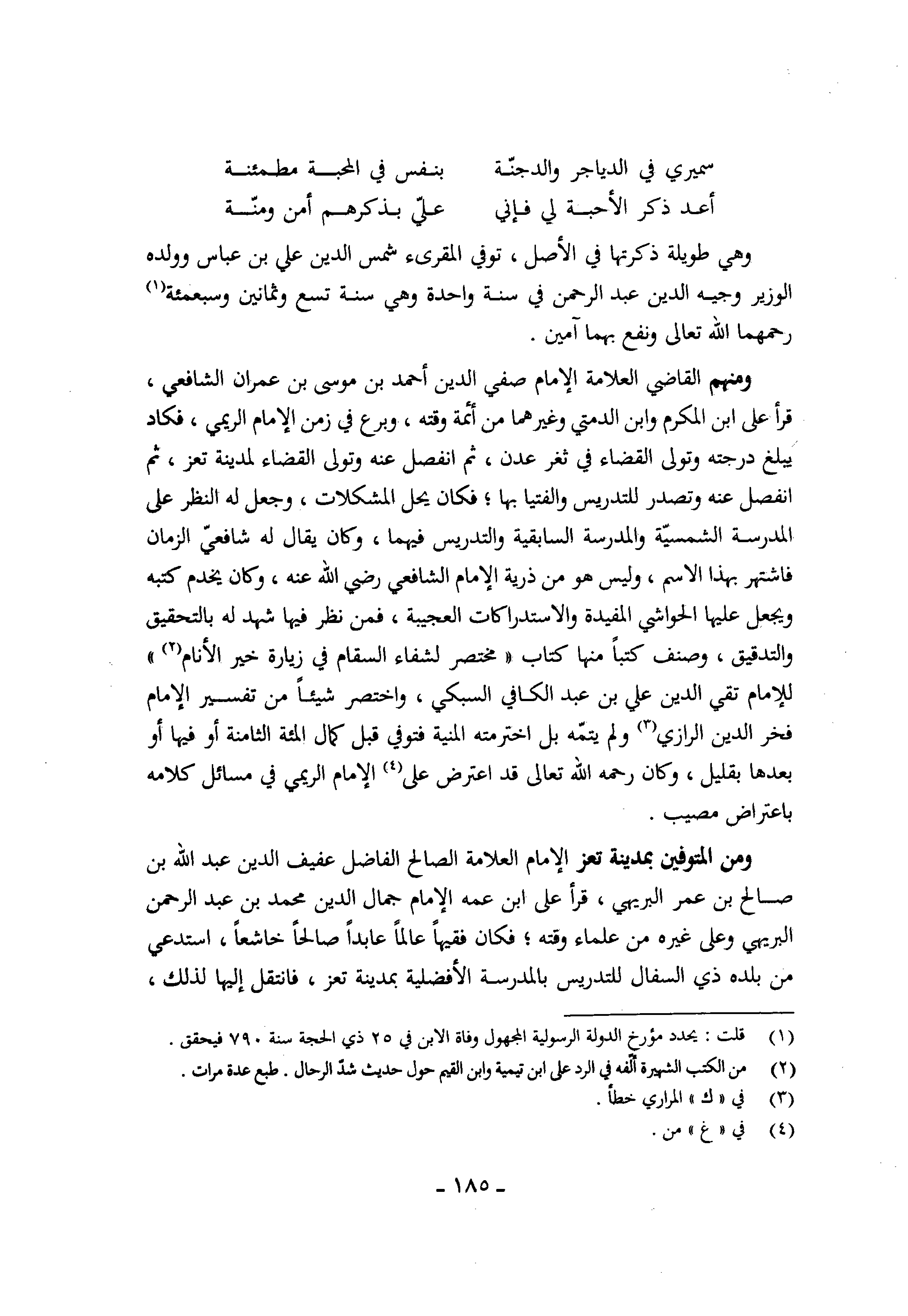 وَمِنْهُم القَاضِي الْعَلامَة الإِمَام صفي الدّين أَحْمد بن مُوسَى بن عمرَان الشَّافِعِي قَرَأَ على ابْن المكرم وَابْن الدمتي وَغَيرهمَا من أَئِمَّة وقته وبرع فِي زمن الإِمَام الريمي فكاد يبلغ دَرَجَته وَتَوَلَّى الْقَضَاء فِي ثغر عدن ثمَّ انْفَصل عَنهُ وَتَوَلَّى الْقَضَاء لمدينة تعز ثمَّ انْفَصل عَنهُ وتصدر للتدريس والفتيا بهَا فَكَانَ يحل المشكلات وَجعل لَهُ النّظر على الْمدرسَة الشمسية والمدرسة السابقية والتدريس فيهمَا وَكَانَ يُقَال لَهُ شَافِعِيّ الزَّمَان فاشتهر بِهَذَا الِاسْم وَلَيْسَ هُوَ من ذُرِّيَّة الإِمَام الشَّافِعِي رَضِي الله عَنهُ وَكَانَ يخْدم كتبه وَيجْعَل عَلَيْهَا الْحَوَاشِي المفيدة والاستدراكات العجيبة فَمن نظر فِيهَا شهد لَهُ بالتحقيق والتدقيق وصنف كتبا مِنْهَا كتاب مُخْتَصر لشفاء السقام فِي زِيَارَة خير الْأَنَام للْإِمَام تَقِيّ الدّين عَليّ بن عبد الْكَافِي السُّبْكِيّ وَاخْتصرَ شَيْئا من تَفْسِير الإِمَام فَخر الدّين الرَّازِيّ وَلم يتمه بل اخترمته الْمنية فَتوفي قبل كَمَال المئة الثَّامِنَة أَو فِيهَا أَو بعْدهَا بِقَلِيل وَكَانَ رَحمَه الله تَعَالَى قد اعْترض على الإِمَام الريمي فِي مسَائِل كَلَامه باعتراض مُصِيب