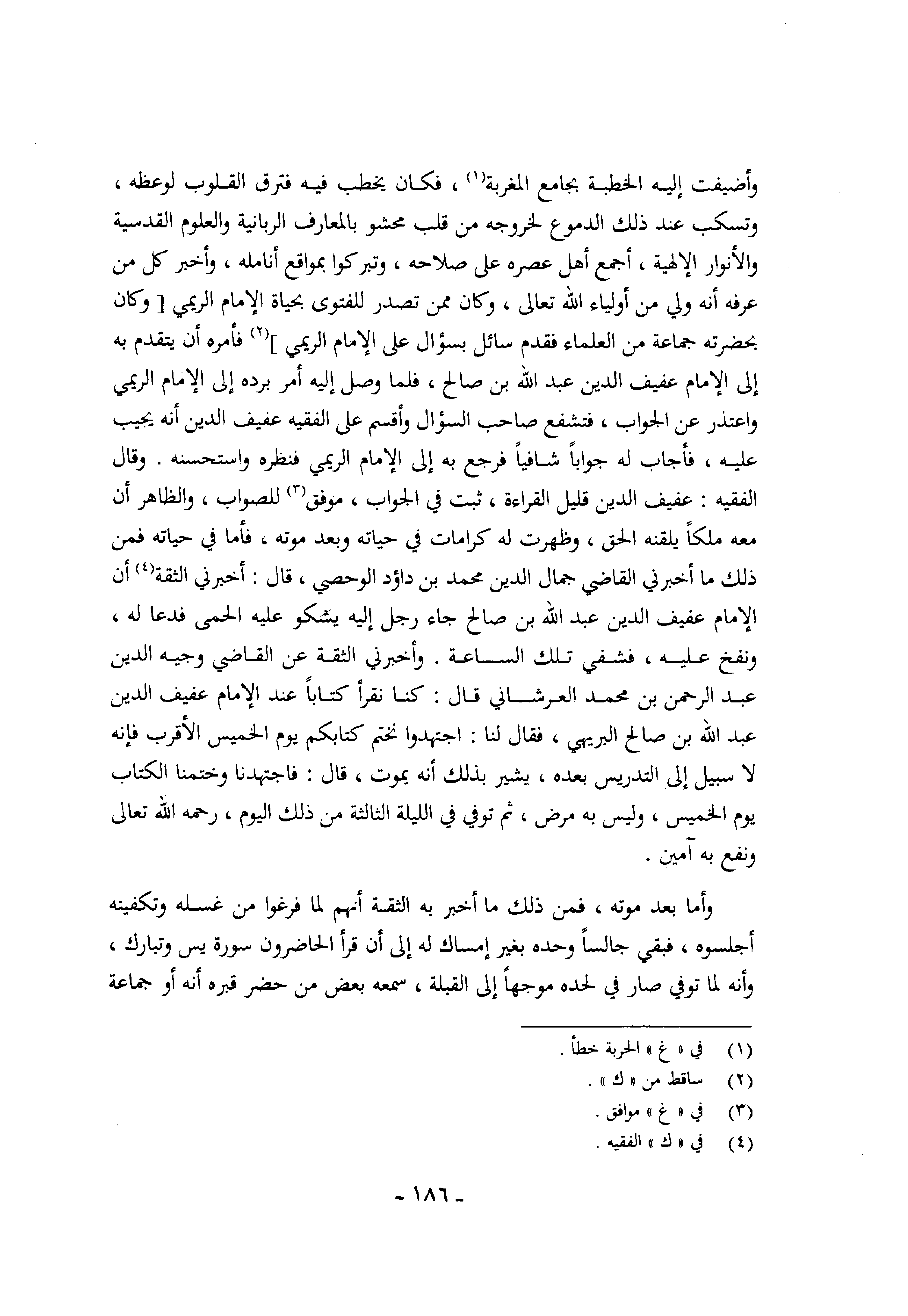 وأضيفت إِلَيْهِ الْخطْبَة بِجَامِع المغربة فَكَانَ يخْطب فِيهِ فترق الْقُلُوب لوعظه وتسكب عِنْد ذَلِك الدُّمُوع لِخُرُوجِهِ من قلب محشو بالمعارف الربانية والعلوم القدسية والأنوار الإلهية أجمع أهل عصره على صَلَاحه وتبركوا بمواقع أنامله وَأخْبر كل من عرفه أَنه ولي من أَوْلِيَاء الله تَعَالَى وَكَانَ مِمَّن تصدر للْفَتْوَى بحياة الإِمَام الريمي وَكَانَ بِحَضْرَتِهِ جمَاعَة من الْعلمَاء فَقدم سَائل بسؤال على الإِمَام الريمي فَأمره أَن يتَقَدَّم بِهِ إِلَى الإِمَام عفيف الدّين عبد الله بن صَالح فَلَمَّا وصل إِلَيْهِ أَمر برده إِلَى الإِمَام الريمي وَاعْتذر عَن الْجَواب فتشفع صَاحب السُّؤَال وَأقسم على الْفَقِيه عفيف الدّين أَنه يُجيب عَلَيْهِ فَأجَاب لَهُ جَوَابا شافيا فَرجع بِهِ إِلَى الإِمَام الريمي فنظره وَاسْتَحْسنهُ وَقَالَ الْفَقِيه عفيف الدّين قَلِيل الْقِرَاءَة ثَبت فِي الْجَواب موفق للصَّوَاب وَالظَّاهِر أَن مَعَه ملكا يلقنه الْحق وَظَهَرت لَهُ كرامات فِي حَيَاته وَبعد مَوته فَأَما فِي حَيَاته فَمن ذَلِك مَا أَخْبرنِي القَاضِي جمال الدّين مُحَمَّد بن داؤد الوحصي قَالَ أَخْبرنِي الثِّقَة أَن الإِمَام عفيف الدّين عبد الله بن صَالح جَاءَ رجل إِلَيْهِ يشكو عَلَيْهِ الْحمى فَدَعَا لَهُ وَنفخ عَلَيْهِ فشفي تِلْكَ السَّاعَة وَأَخْبرنِي الثِّقَة عَن القَاضِي وجيه الدّين عبد الرَّحْمَن بن مُحَمَّد العرشاني قَالَ كُنَّا نَقْرَأ كتابا عِنْد الإِمَام عفيف الدّين عبد الله بن صَالح البريهي فَقَالَ لنا اجتهدوا نختم كتابكُمْ يَوْم الْخَمِيس الْأَقْرَب فَإِنَّهُ لَا سَبِيل إِلَى التدريس بعده يُشِير بذلك أَنه يَمُوت قَالَ فاجتهدنا وختمنا الْكتاب يَوْم الْخَمِيس وَلَيْسَ بِهِ مرض ثمَّ توفّي فِي اللَّيْلَة الثَّالِثَة من ذَلِك الْيَوْم رَحمَه الله تَعَالَى ونفع بِهِ آمين