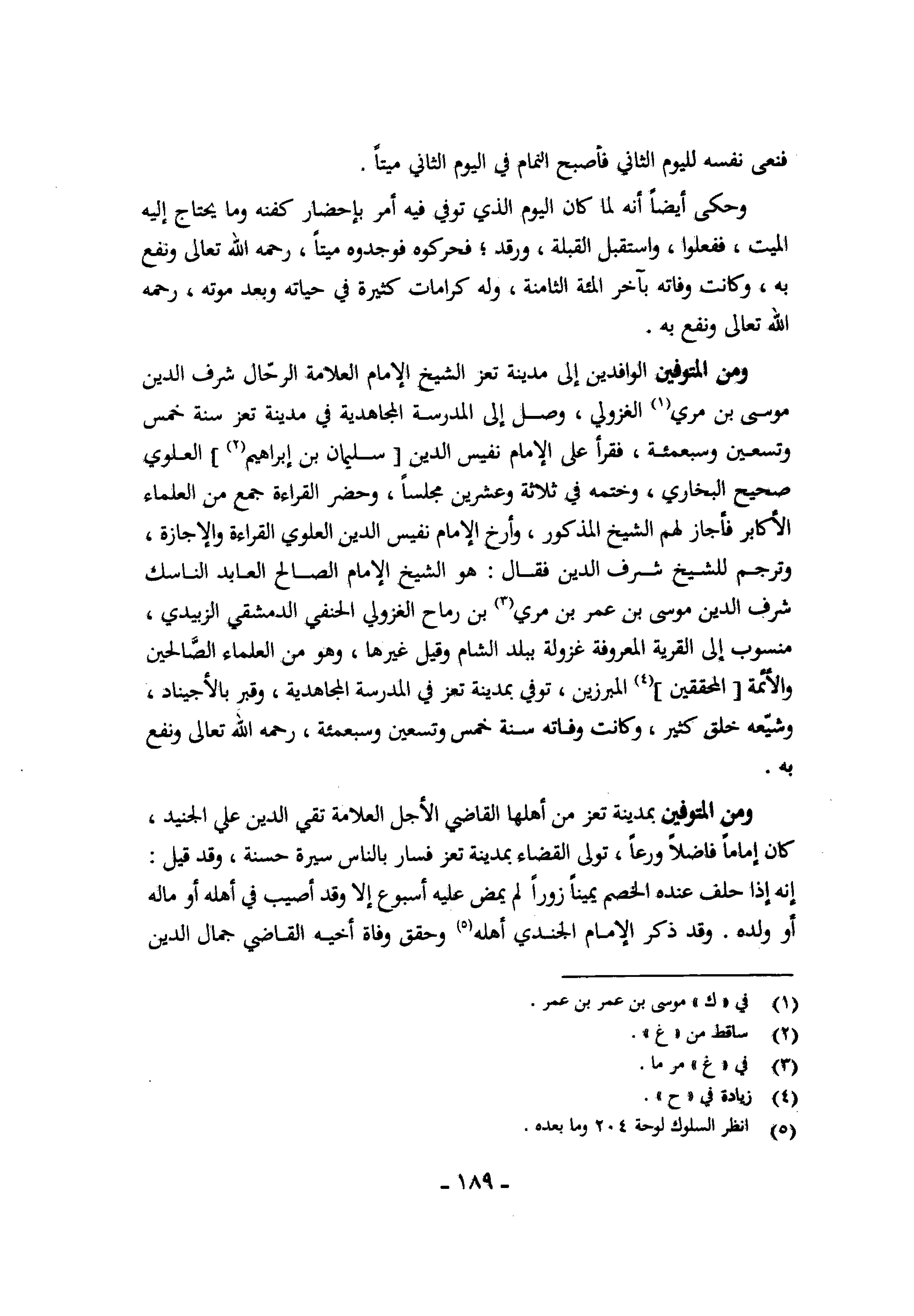 وَمن المتوفين الوافدين إِلَى مَدِينَة تعز الشَّيْخ الإِمَام الْعَلامَة الرّحال شرف الدّين مُوسَى بن مري الغزولي وصل إِلَى الْمدرسَة المجاهدية فِي مَدِينَة تعز سنة خمس وَتِسْعين وسبعمئة فَقَرَأَ على الإِمَام نَفِيس الدّين سُلَيْمَان بن إِبْرَاهِيم الْعلوِي صَحِيح البُخَارِيّ وختمه فِي ثَلَاثَة وَعشْرين مَجْلِسا وَحضر الْقِرَاءَة جمع من الْعلمَاء الأكابر فَأجَاز لَهُم الشَّيْخ الْمَذْكُور وأرخ الإِمَام نَفِيس الدّين الْعلوِي الْقِرَاءَة وَالْإِجَازَة وَترْجم للشَّيْخ شرف الدّين فَقَالَ هُوَ الشَّيْخ الإِمَام الصَّالح العابد الناسك شرف الدّين مُوسَى بن عمر بن مري بن رماح الغزولي الْحَنَفِيّ الدِّمَشْقِي الزبيدِيّ مَنْسُوب إِلَى الْقرْيَة الْمَعْرُوفَة غزولة بِبَلَد الشَّام وَقيل غَيرهَا وَهُوَ من الْعلمَاء الصَّالِحين وَالْأَئِمَّة الْمُحَقِّقين المبرزين توفّي بِمَدِينَة تعز فِي الْمدرسَة المجاهدية وقبر بالأجيناد وشيعه خلق كثير وَكَانَت وَفَاته سنة خمس وَتِسْعين وسبعمئة رَحمَه الله تَعَالَى ونفع بِهِ