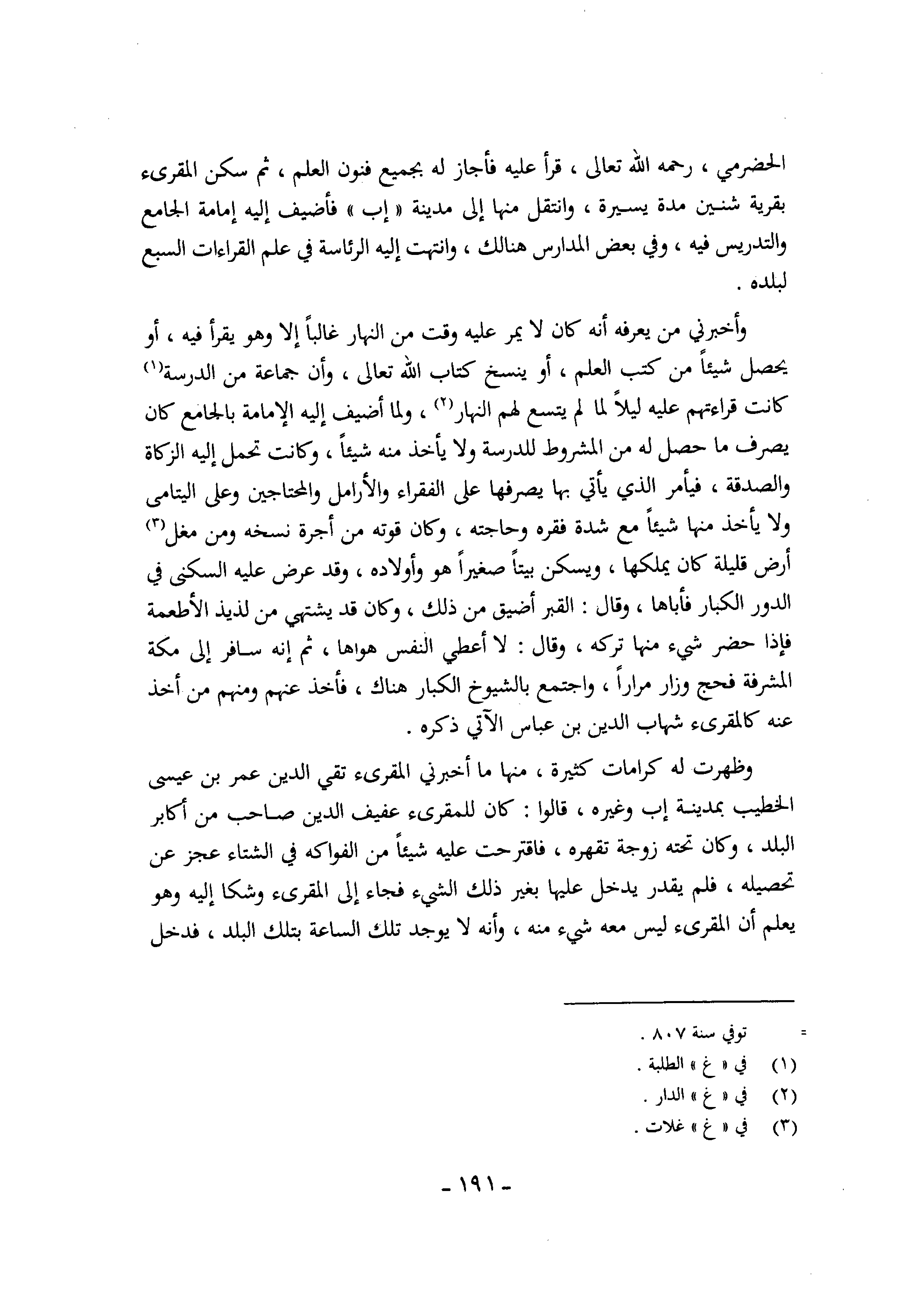 وَأَخْبرنِي من يعرفهُ أَنه كَانَ لَا يمر عَلَيْهِ وَقت من النَّهَار غَالِبا إِلَّا وَهُوَ يقْرَأ فِيهِ أَو يحصل شَيْئا من كتب الْعلم أَو ينْسَخ كتاب الله تَعَالَى وَأَن جمَاعَة من الدرسة كَانَت قراءتهم عَلَيْهِ لَيْلًا لما لم يَتَّسِع لَهُم النَّهَار وَلما أضيف إِلَيْهِ الْإِمَامَة بالجامع كَانَ يصرف مَا حصل لَهُ من الْمَشْرُوط للدرسة وَلَا يَأْخُذ مِنْهُ شَيْئا وَكَانَت تحمل إِلَيْهِ الزَّكَاة وَالصَّدَََقَة فيأمر الَّذِي يَأْتِي بهَا يصرفهَا على الْفُقَرَاء والأرامل والمحتاجين وعَلى الْيَتَامَى وَلَا يَأْخُذ مِنْهَا شَيْئا مَعَ شدَّة فقره وَحَاجته وَكَانَ قوته من أُجْرَة نسخه وَمن مغل أَرض قَليلَة كَانَ يملكهَا ويسكن بَيْتا صَغِيرا هُوَ وَأَوْلَاده وَقد عرض عَلَيْهِ السُّكْنَى فِي الدّور الْكِبَار فأباها وَقَالَ الْقَبْر أضيق من ذَلِك وَكَانَ قد يَشْتَهِي من لذيذ الْأَطْعِمَة فَإِذا حضر شَيْء مِنْهَا تَركه وَقَالَ لَا أعطي النَّفس هَواهَا ثمَّ إِنَّه سَافر إِلَى مَكَّة المشرفة فحج وزار مرَارًا وَاجْتمعَ بالشيوخ الْكِبَار هُنَاكَ فَأخذ عَنْهُم وَمِنْهُم من أَخذ عَنهُ كالمقرىء شهَاب الدّين بن عَبَّاس الْآتِي ذكره