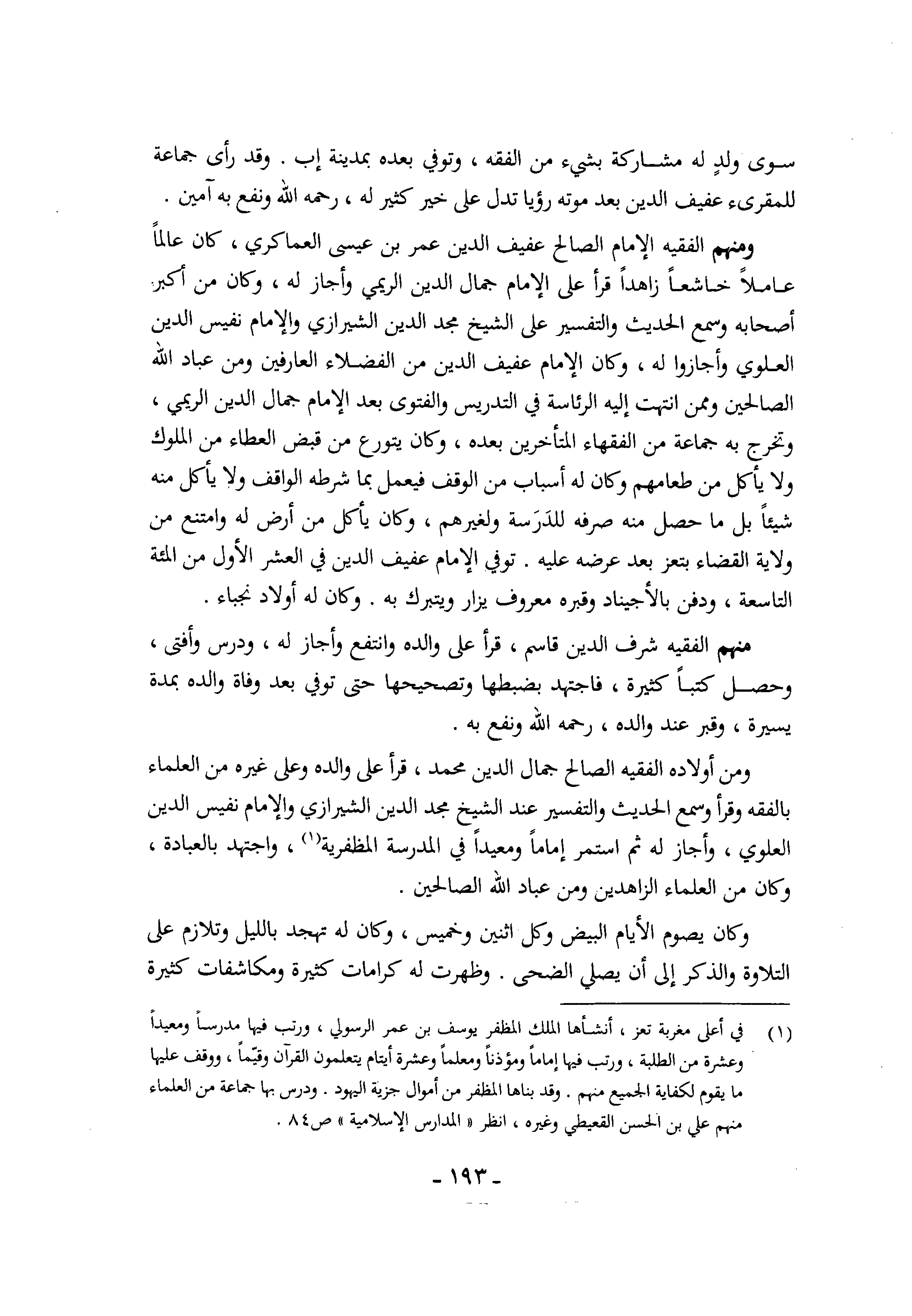 وَمِنْهُم الْفَقِيه الإِمَام الصَّالح عفيف الدّين عمر بن عِيسَى العماكري كَانَ عَالما عَاملا خَاشِعًا زاهدا قَرَأَ على الإِمَام جمال الدّين الريمي وَأَجَازَ لَهُ وَكَانَ من أكبر أَصْحَابه وَسمع الحَدِيث وَالتَّفْسِير على الشَّيْخ مجد الدّين الشِّيرَازِيّ وَالْإِمَام نَفِيس الدّين الْعلوِي وأجازوا لَهُ وَكَانَ الإِمَام عفيف الدّين من الْفُضَلَاء العارفين وَمن عباد الله الصَّالِحين وَمِمَّنْ انْتَهَت إِلَيْهِ الرِّئَاسَة فِي التدريس وَالْفَتْوَى بعد الإِمَام جمال الدّين الريمي وَتخرج بِهِ جمَاعَة من الْفُقَهَاء الْمُتَأَخِّرين بعده وَكَانَ يتورع من قبض الْعَطاء من الْمُلُوك وَلَا يَأْكُل من طعامهم وَكَانَ لَهُ أَسبَاب من الْوَقْف فَيعْمل بِمَا شَرطه الْوَاقِف وَلَا يَأْكُل مِنْهُ شَيْئا بل مَا حصل مِنْهُ صرفه للدرسة ولغيرهم وَكَانَ يَأْكُل من أَرض لَهُ وَامْتنع من ولَايَة الْقَضَاء بتعز بعد عرضه عَلَيْهِ
