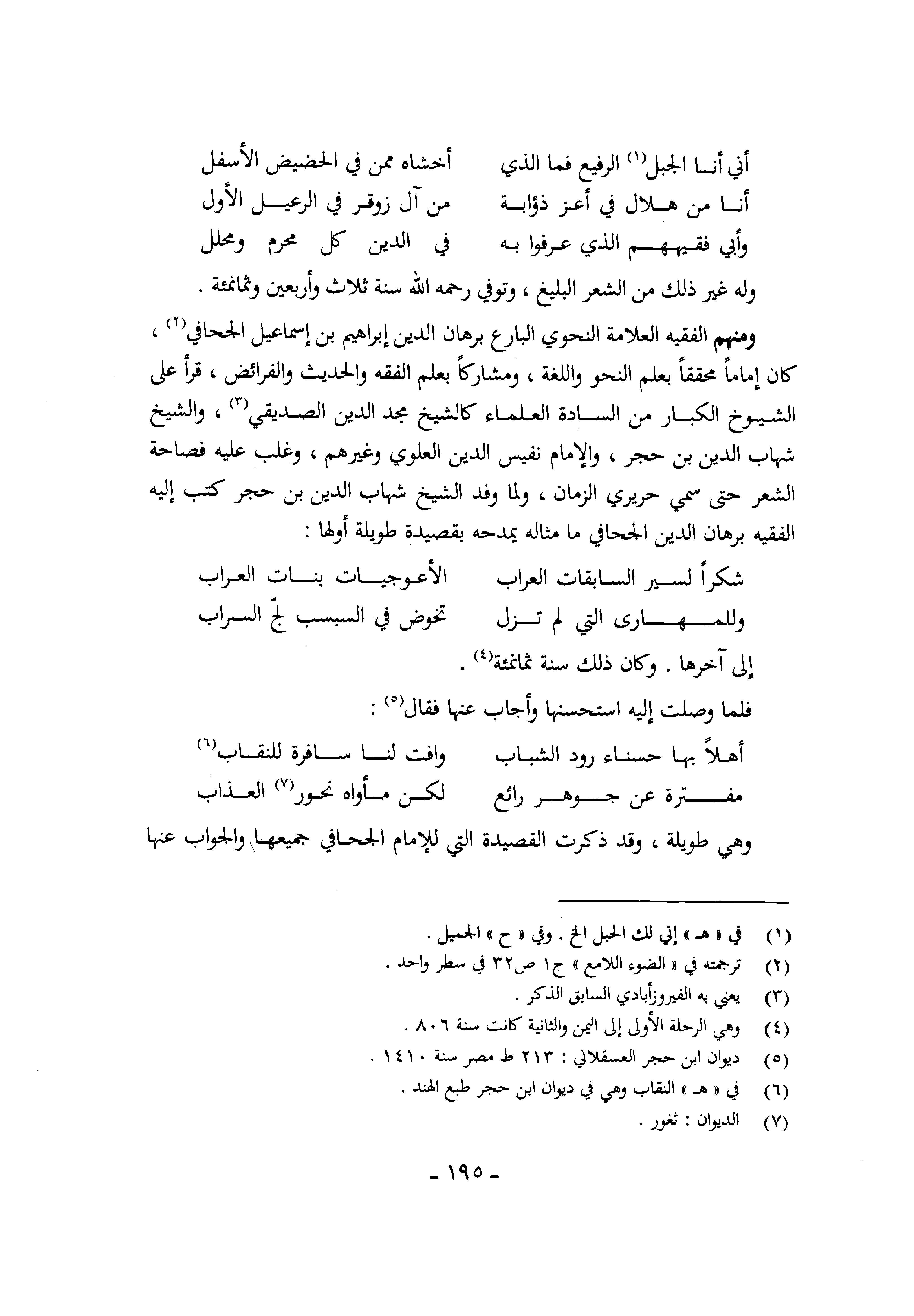 وَمِنْهُم الْفَقِيه الْعَلامَة النَّحْوِيّ البارع برهَان الدّين إِبْرَاهِيم بن إِسْمَاعِيل الجحافي كَانَ إِمَامًا محققا بِعلم النَّحْو واللغة ومشاركا بِعلم الْفِقْه والْحَدِيث والفرائض قَرَأَ على الشُّيُوخ الْكِبَار من السَّادة الْعلمَاء كالشيخ مجد الدّين الصديقي وَالشَّيْخ شهَاب الدّين بن حجر وَالْإِمَام نَفِيس الدّين الْعلوِي وَغَيرهم وَغلب عَلَيْهِ فصاحة الشّعْر حَتَّى سمي حريري الزَّمَان وَلما وَفد الشَّيْخ شهَاب الدّين بن حجر كتب إِلَيْهِ الْفَقِيه برهَان الدّين الجحافي مَا مِثَاله يمدحه بقصيدة طَوِيلَة أَولهَا