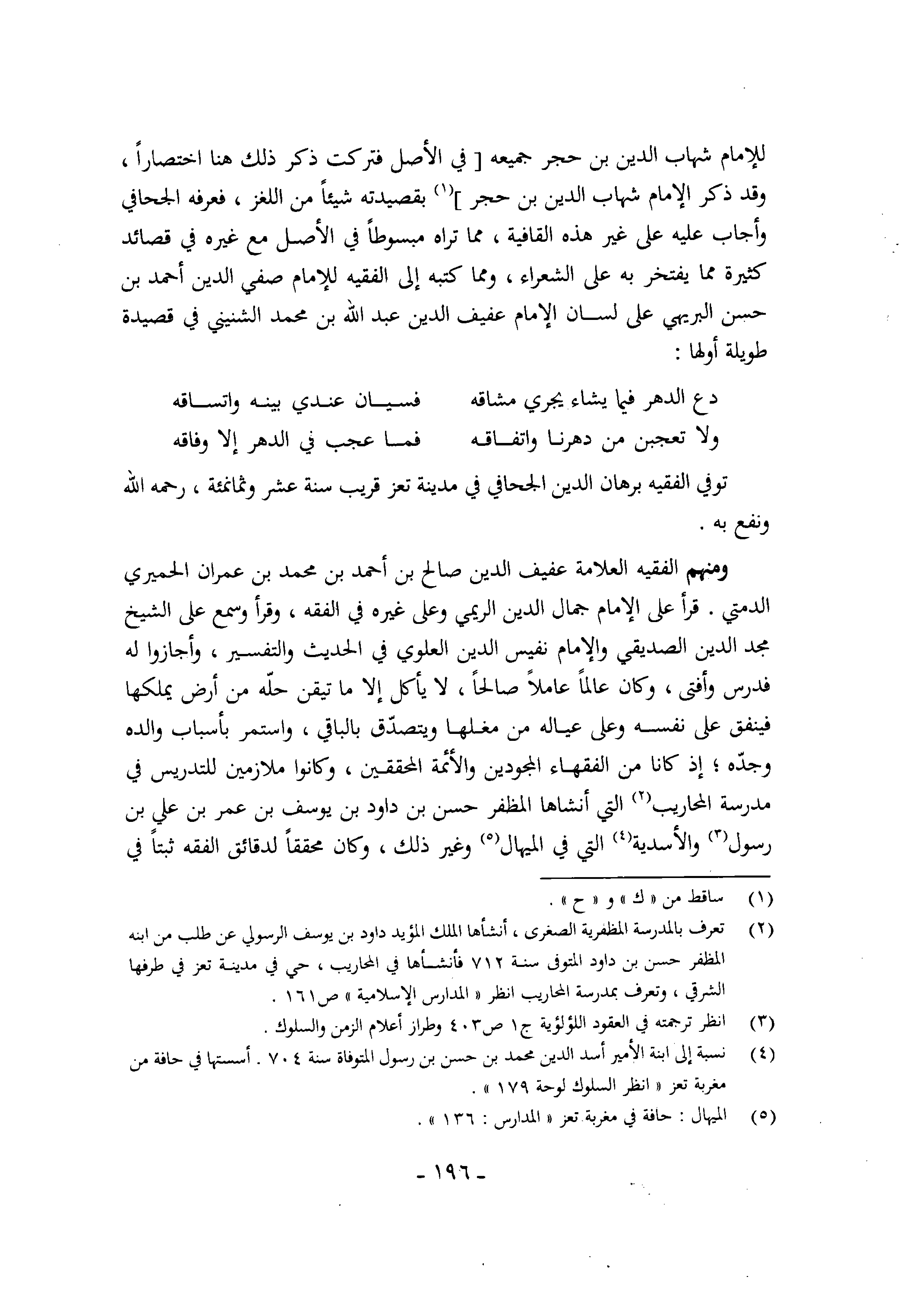 للْإِمَام شهَاب الدّين بن حجر جَمِيعه فِي الأَصْل فَتركت ذكر ذَلِك هُنَا اختصارا وَقد ذكر الإِمَام شهَاب الدّين بن حجر بقصيدته شَيْئا من اللغز فَعرفهُ الجحافي وَأجَاب عَلَيْهِ على غير هَذِه القافية مِمَّا ترَاهُ مَبْسُوطا فِي الأَصْل مَعَ غَيره فِي قصائد كَثِيرَة مِمَّا يفتخر بِهِ على الشُّعَرَاء وَمِمَّا كتبه إِلَى الْفَقِيه للْإِمَام صفي الدّين أَحْمد بن حسن البريهي على لِسَان الإِمَام عفيف الدّين عبد الله بن مُحَمَّد الشنيني فِي قصيدة طَوِيلَة أَولهَا