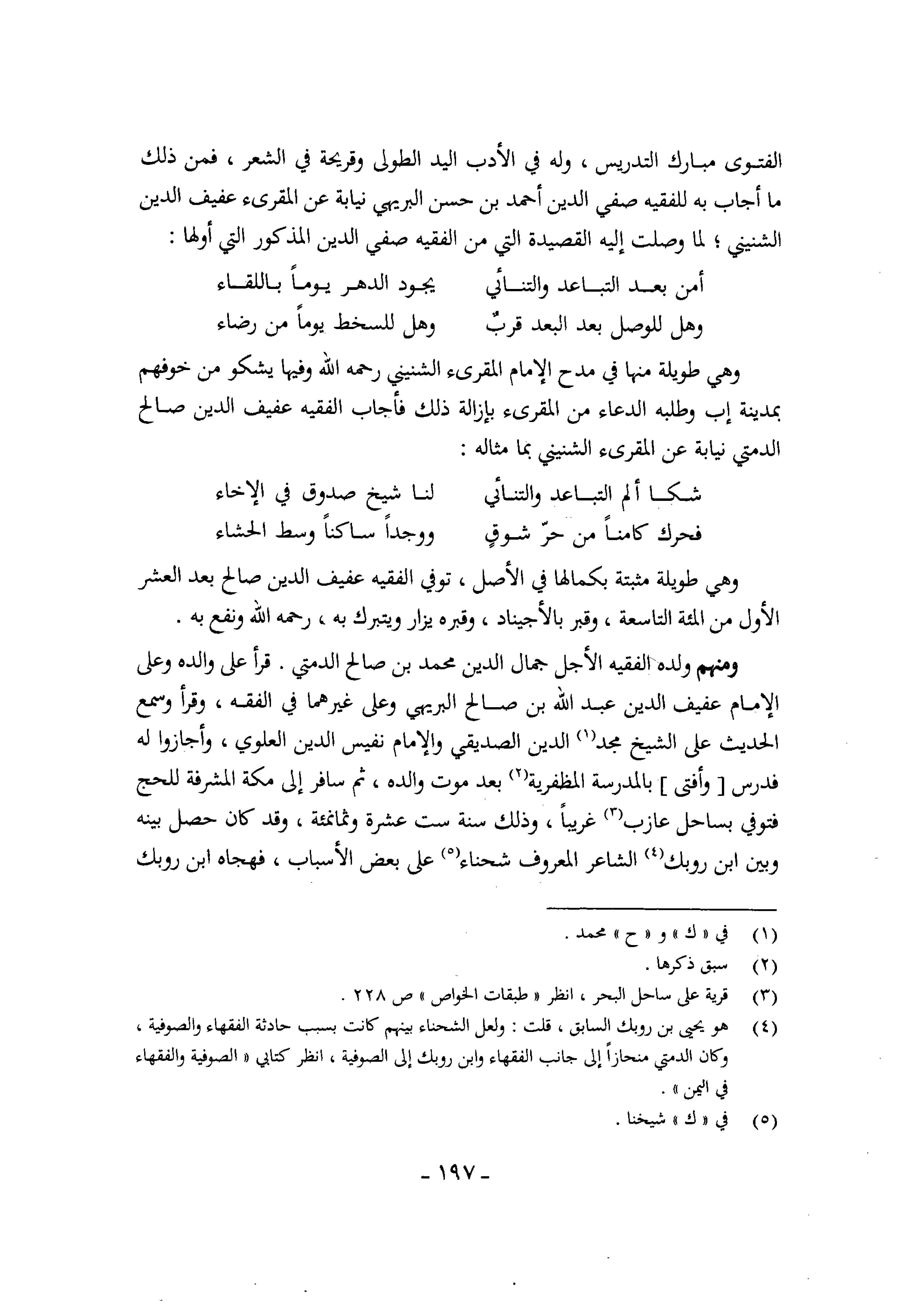 الْفَتْوَى مبارك التدريس وَله فِي الْأَدَب الْيَد الطُّولى وقريحة فِي الشّعْر فَمن ذَلِك مَا أجَاب بِهِ للفقيه صفي الدّين أَحْمد بن حسن البريهي نِيَابَة عَن المقرىء عفيف الدّين الشنيني لما وصلت إِلَيْهِ القصيدة الَّتِي من الْفَقِيه صفي الدّين الْمَذْكُور الَّتِي أَولهَا