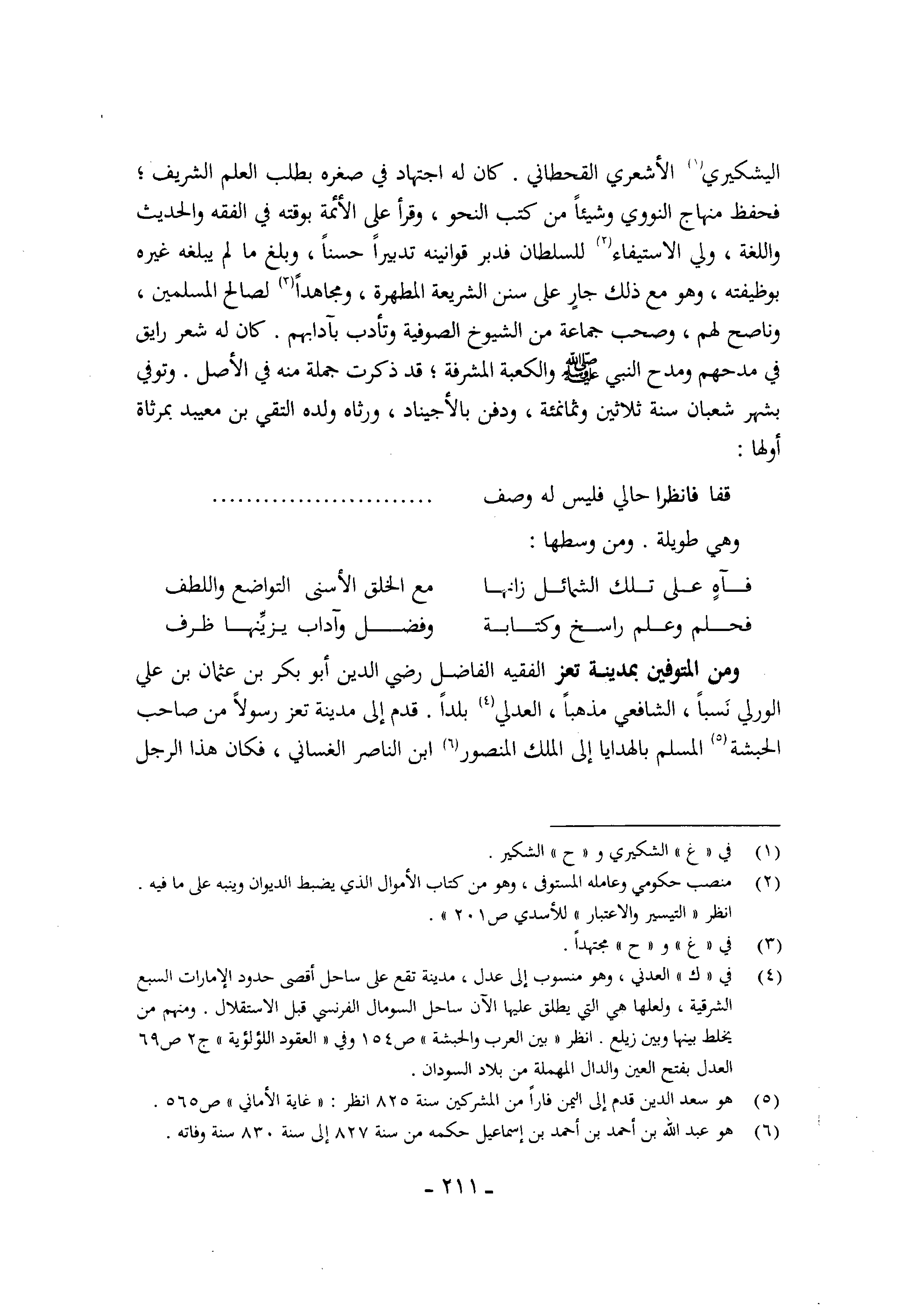 اليشكيري الْأَشْعَرِيّ القحطاني كَانَ لَهُ اجْتِهَاد فِي صغره بِطَلَب الْعلم الشريف فحفظ منهاج النَّوَوِيّ وشيئا من كتب النَّحْو وَقَرَأَ على الْأَئِمَّة بوقته فِي الْفِقْه والْحَدِيث واللغة ولي الِاسْتِيفَاء للسُّلْطَان فدبر قوانينه تدبيرا حسنا وَبلغ مَا لم يبلغهُ غَيره بوظيفته وَهُوَ مَعَ ذَلِك جَار على سنَن الشَّرِيعَة المطهرة ومجاهدا لصالح الْمُسلمين وناصح لَهُم وَصَحب جمَاعَة من الشُّيُوخ الصُّوفِيَّة وتأدب بآدابهم كَانَ لَهُ شعر رايق فِي مدحهم ومدح النَّبِي صلى الله عَلَيْهِ وَسلم والكعبة المشرفة قد ذكرت جملَة مِنْهُ فِي الأَصْل وَتُوفِّي بِشَهْر شعْبَان سنة ثَلَاثِينَ وثمانمئة وَدفن بالأجيناد ورثاه وَلَده التقي بن معيبد بمرثاة أَولهَا