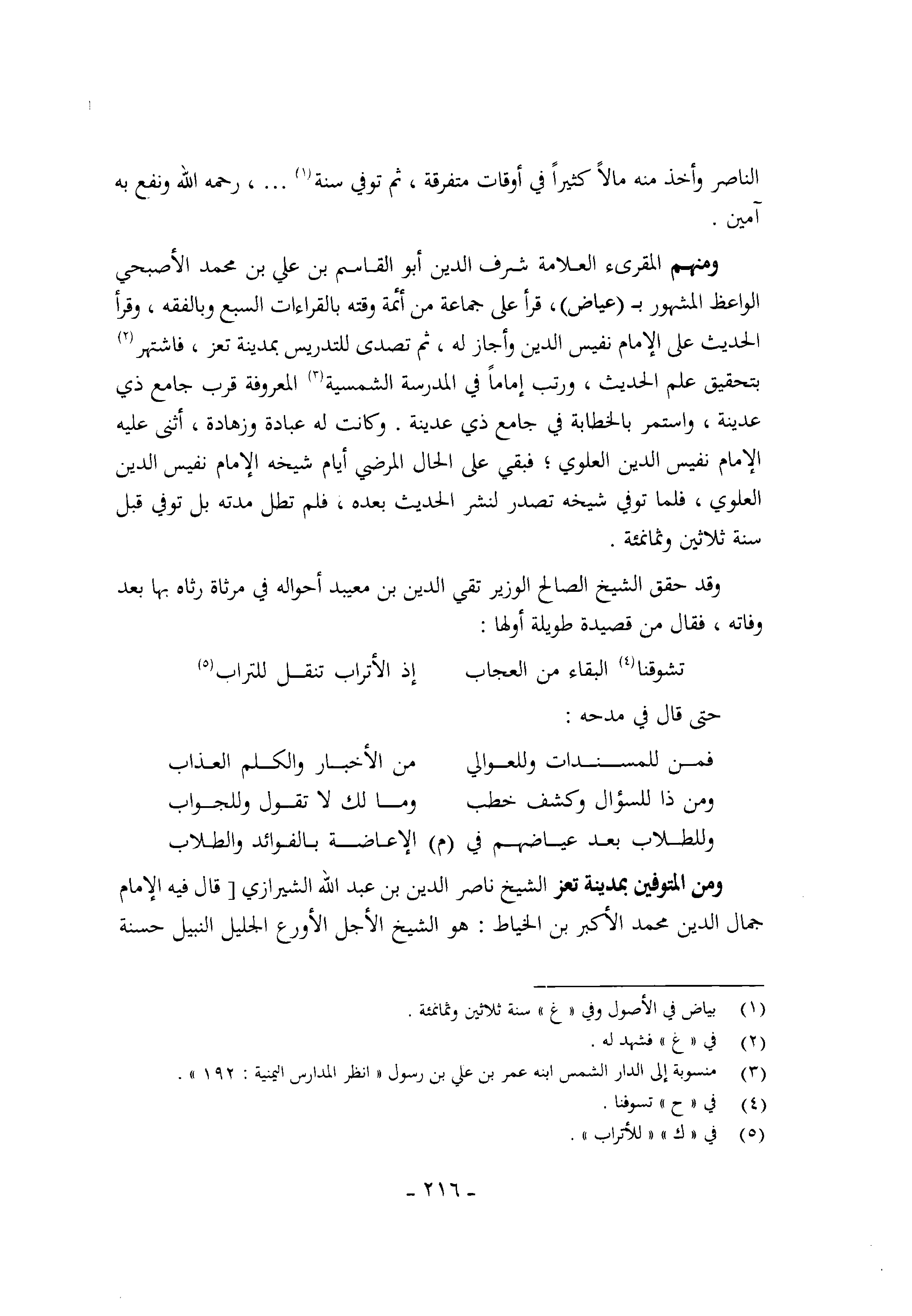 وَمِنْهُم المقرىء الْعَلامَة شرف الدّين أَبُو الْقَاسِم بن عَليّ بن مُحَمَّد الأصبحي الْوَاعِظ الْمَشْهُور ب عِيَاض قَرَأَ على جمَاعَة من أَئِمَّة وقته بالقراءات السَّبع وبالفقه وَقَرَأَ الحَدِيث على الإِمَام نَفِيس الدّين وَأَجَازَ لَهُ ثمَّ تصدى للتدريس بِمَدِينَة تعز فاشتهر بتحقيق علم الحَدِيث ورتب إِمَامًا فِي الْمدرسَة الشمسية الْمَعْرُوفَة قرب جَامع ذِي عدينة وَاسْتمرّ بالخطابة فِي جَامع ذِي عدينة وَكَانَت لَهُ عبَادَة وزهادة أثنى عَلَيْهِ الإِمَام نَفِيس الدّين الْعلوِي فَبَقيَ على الْحَال المرضي أَيَّام شَيْخه الإِمَام نَفِيس الدّين الْعلوِي فَلَمَّا توفّي شَيْخه تصدر لنشر الحَدِيث بعده فَلم تطل مدَّته بل توفّي قبل سنة ثَلَاثِينَ وثمانمئة