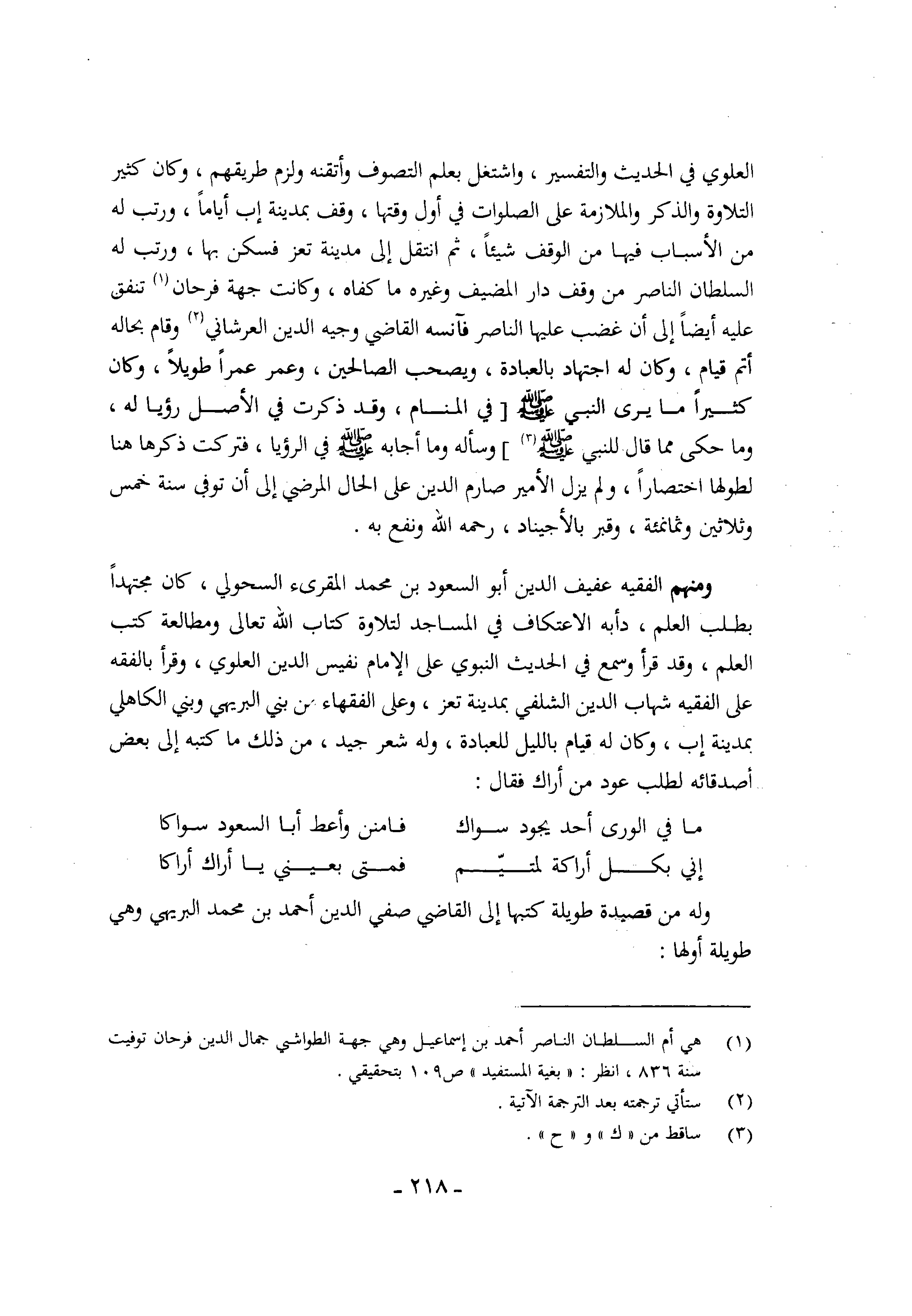 وَمِنْهُم الْفَقِيه عفيف الدّين أَبُو السُّعُود بن مُحَمَّد المقرىء السحولي كَانَ مُجْتَهدا بِطَلَب الْعلم دأبه الِاعْتِكَاف فِي الْمَسَاجِد لتلاوة كتاب الله تَعَالَى ومطالعة كتب الْعلم وَقد قَرَأَ وَسمع فِي الحَدِيث النَّبَوِيّ على الإِمَام نَفِيس الدّين الْعلوِي وَقَرَأَ بالفقه على الْفَقِيه شهَاب الدّين الشلفي بِمَدِينَة تعز وعَلى الْفُقَهَاء من بني البريهي وَبني الْكَاهِلِي بِمَدِينَة إب وَكَانَ لَهُ قيام بِاللَّيْلِ لِلْعِبَادَةِ وَله شعر جيد من ذَلِك مَا كتبه إِلَى بعض أصدقائه لطلب عود من أَرَاك فَقَالَ
