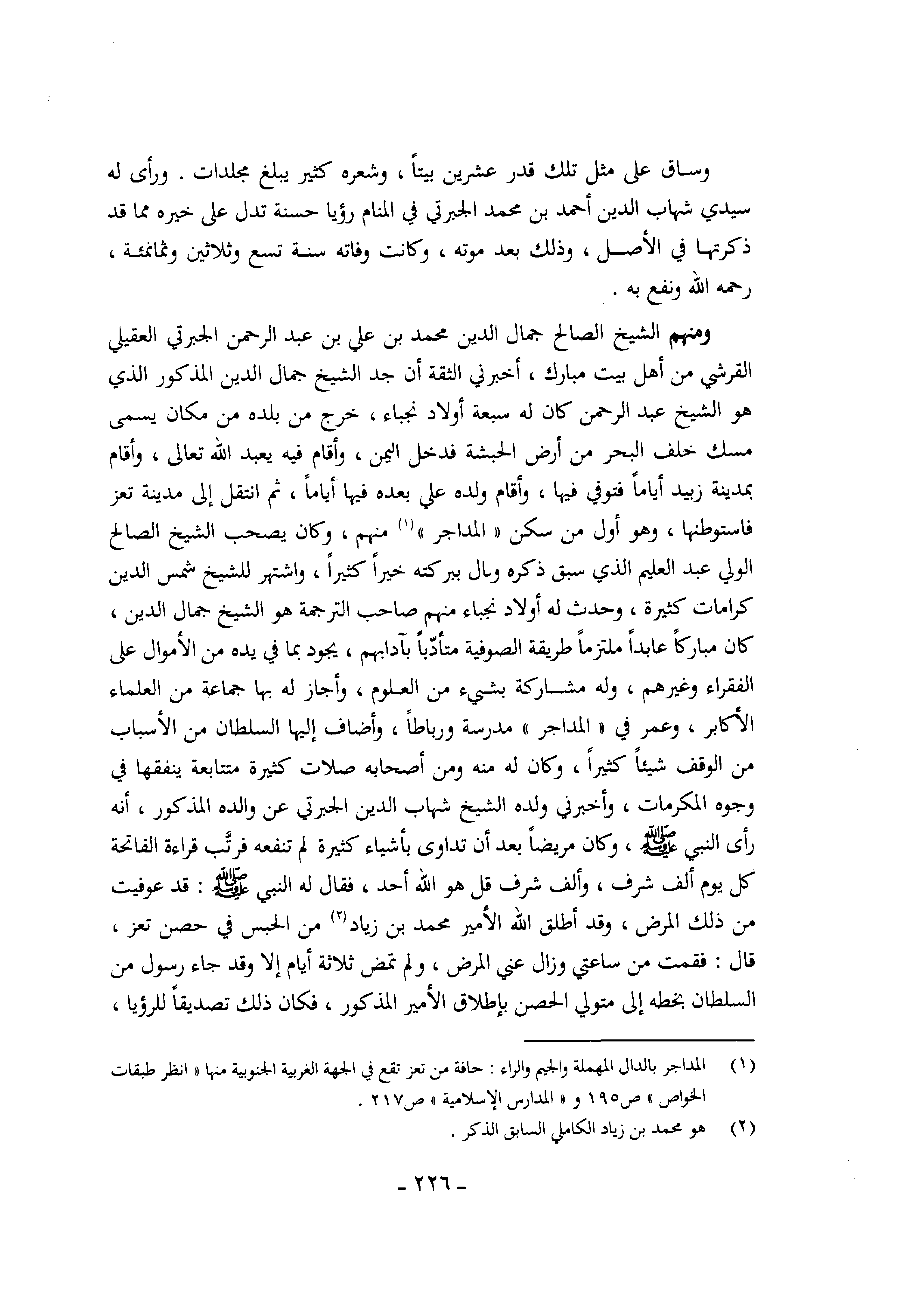 وَمِنْهُم الشَّيْخ الصَّالح جمال الدّين مُحَمَّد بن عَليّ بن عبد الرَّحْمَن الجبرتي الْعقيلِيّ الْقرشِي من أهل بَيت مبارك أَخْبرنِي الثِّقَة أَن جد الشَّيْخ جمال الدّين الْمَذْكُور الَّذِي هُوَ الشَّيْخ عبد الرَّحْمَن كَانَ لَهُ سَبْعَة أَوْلَاد نجباء خرج من بَلَده من مَكَان يُسمى مسك خلف الْبَحْر من أَرض الْحَبَشَة فَدخل الْيمن وَأقَام فِيهِ يعبد الله تَعَالَى وَأقَام بِمَدِينَة زبيد أَيَّامًا فَتوفي فِيهَا وَأقَام وَلَده عَليّ بعده فِيهَا أَيَّامًا ثمَّ انْتقل إِلَى مَدِينَة تعز فاستوطنها وَهُوَ أول من سكن المداجر مِنْهُم وَكَانَ يصحب الشَّيْخ الصَّالح الْوَلِيّ عبد الْعَلِيم الَّذِي سبق ذكره ونال ببركته خيرا كثيرا واشتهر للشَّيْخ شمس الدّين كرامات كَثِيرَة وَحدث لَهُ أَوْلَاد نجباء مِنْهُم صَاحب التَّرْجَمَة هُوَ الشَّيْخ جمال الدّين كَانَ مُبَارَكًا عابدا مُلْتَزما طَريقَة الصُّوفِيَّة متأدبا بآدابهم يجود بِمَا فِي يَده من الْأَمْوَال على الْفُقَرَاء وَغَيرهم وَله مُشَاركَة بِشَيْء من الْعُلُوم وَأَجَازَ لَهُ بهَا جمَاعَة من الْعلمَاء الأكابر وَعمر فِي المداجر مدرسة ورباطا وأضاف إِلَيْهَا السُّلْطَان من الْأَسْبَاب من الْوَقْف شَيْئا كثيرا وَكَانَ لَهُ مِنْهُ وَمن أَصْحَابه صلات كَثِيرَة متتابعة ينفقها فِي وُجُوه المكرمات وَأَخْبرنِي وَلَده الشَّيْخ شهَاب الدّين الجبرتي عَن وَالِده الْمَذْكُور أَنه رأى النَّبِي صلى الله عَلَيْهِ وَسلم وَكَانَ مَرِيضا بعد أَن تداوى بأَشْيَاء كَثِيرَة لم تَنْفَعهُ فرتب قِرَاءَة الْفَاتِحَة كل يَوْم ألف شرف وَألف شرف قل هُوَ الله أحد فَقَالَ لَهُ النَّبِي صلى الله عَلَيْهِ وَسلم قد عوفيت من ذَلِك الْمَرَض وَقد أطلق الله الْأَمِير مُحَمَّد بن زِيَاد من الْحَبْس فِي حصن تعز قَالَ فَقُمْت من سَاعَتِي وَزَالَ عني الْمَرَض وَلم تمض ثَلَاثَة أَيَّام إِلَّا وَقد جَاءَ رَسُول من السُّلْطَان بِخَطِّهِ إِلَى مُتَوَلِّي الْحصن بِإِطْلَاق الْأَمِير الْمَذْكُور فَكَانَ ذَلِك تَصْدِيقًا للرؤيا